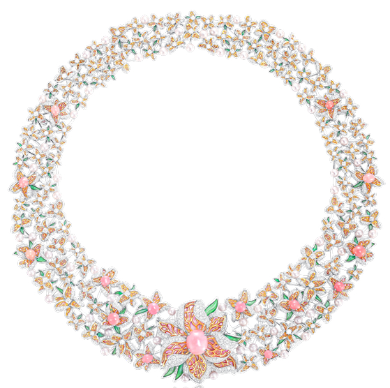 La structure du collier, composée de plus de mille éléments d’une précision extrême, se pose sur le cou telle une dentelle aérienne. D’une légèreté saisissante, elle n’en demeure pas moins d’une stabilité exemplaire, fidèle à l’exigence de la haute joaillerie.