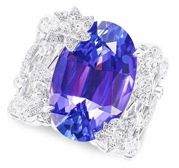 Pierre principale : Tanzanite taille ovale, 12,73 carats – Pierres secondaires : 228 Diamants, 1,49 carats – Serti en or blanc 18 carats