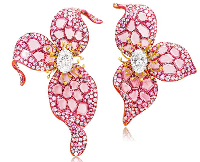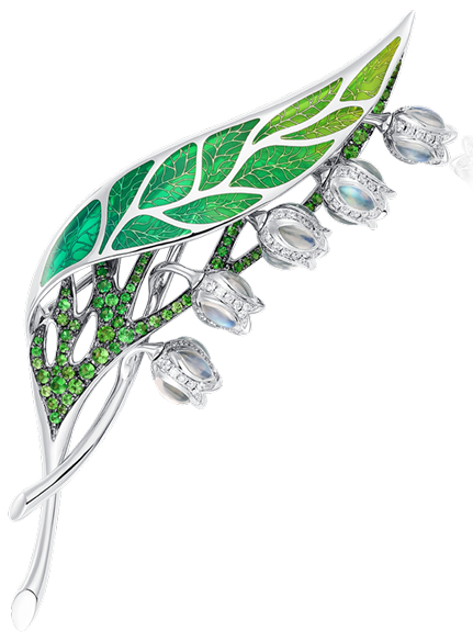 Inspirées du jardin de Monet à Giverny. Pour saisir l’élan véritable du vivant, Christine Chen a fait entrer des fleurs fraîches dans l’atelier. Chaque jour, les artisans en ont esquissé les formes – du bourgeon à l’épanouissement – attendant que la fleur prenne vie sur le papier avant de sculpter la cire. Les boucles d’oreilles associent saphirs taille rose ancienne, taillés en finesse des deux côtés, à une structure en titane ultralégère, épousant le mouvement naturel des pétales. La broche muguet, en émail plique-à-jour, dévoile des corolles translucides, rehaussées de pierres de lune au velouté nacré – comme la rosée d’un matin clair. Dans le jeu subtil entre la structure et la lumière filtrée, cette création capture l’instant suspendu de la floraison, fragile et éternelle.