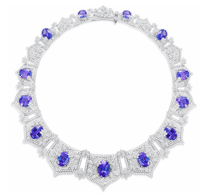 Pierres principales : 13 Tanzanites taille ovale, 90,55 carats – Pierres secondaires : 3 144 Diamants, 17,56 carats – Serti en or blanc 18 carats