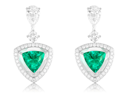Pierres principales : Une paire d’Émeraudes de Colombie taille trillion, 3,42 carats – Pierres secondaires : 4 Diamants, 2,73 carats | 188 Diamants, 2,03 carats | 2 Cristaux, 1,79 carats