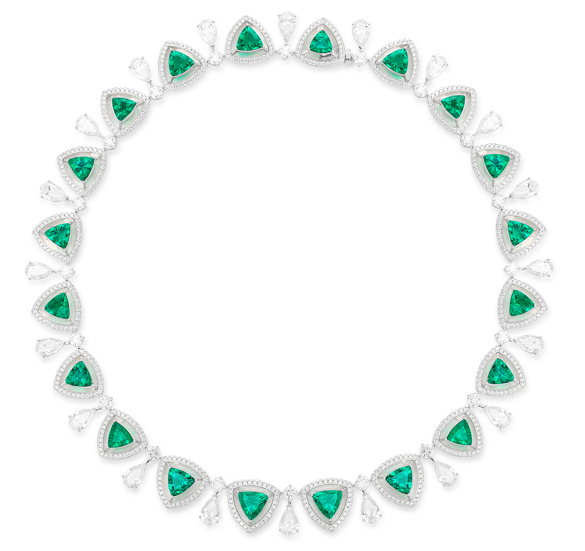 Pierres principales : 20 Émeraudes de Colombie taille trillion, 25,63 carats – Pierres secondaires : 40 Diamants, 26,82 carats | 1 198 Diamants, 13,81 carats | 20 Cristaux, 18,06 carats