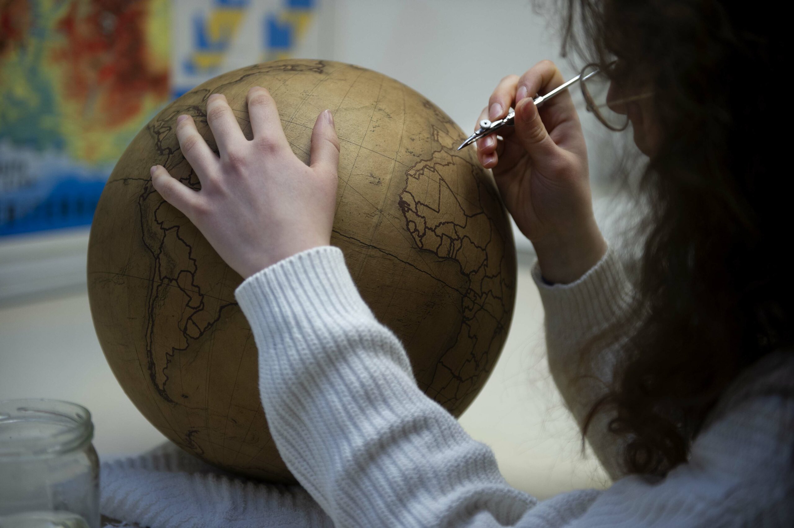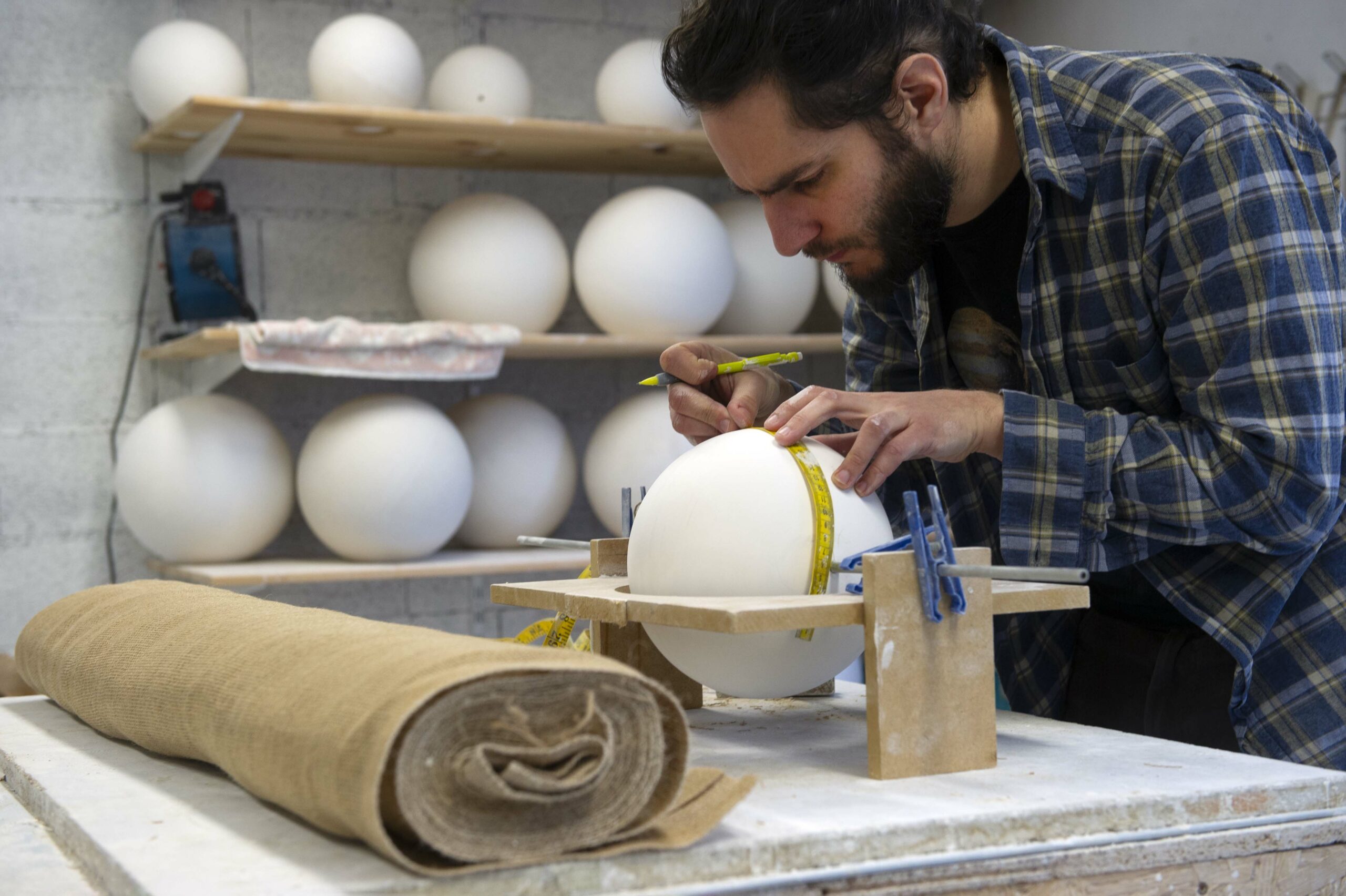 Plusieurs étapes sont nécessaires afin de créer un globe terrestre luxueux. La première consiste à façonner la sphère grâce à une formule à base de plâtre et d’ingrédients naturels. Cette étape est cruciale, car elle doit être parfaitement lisse et équilibrée. Une fois les deux demi-sphères en plâtre assemblées, il faut tracer des repères au crayon pour pouvoir coller la carte correctement.