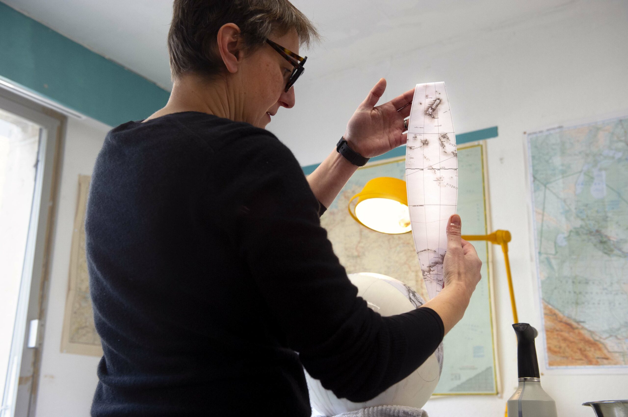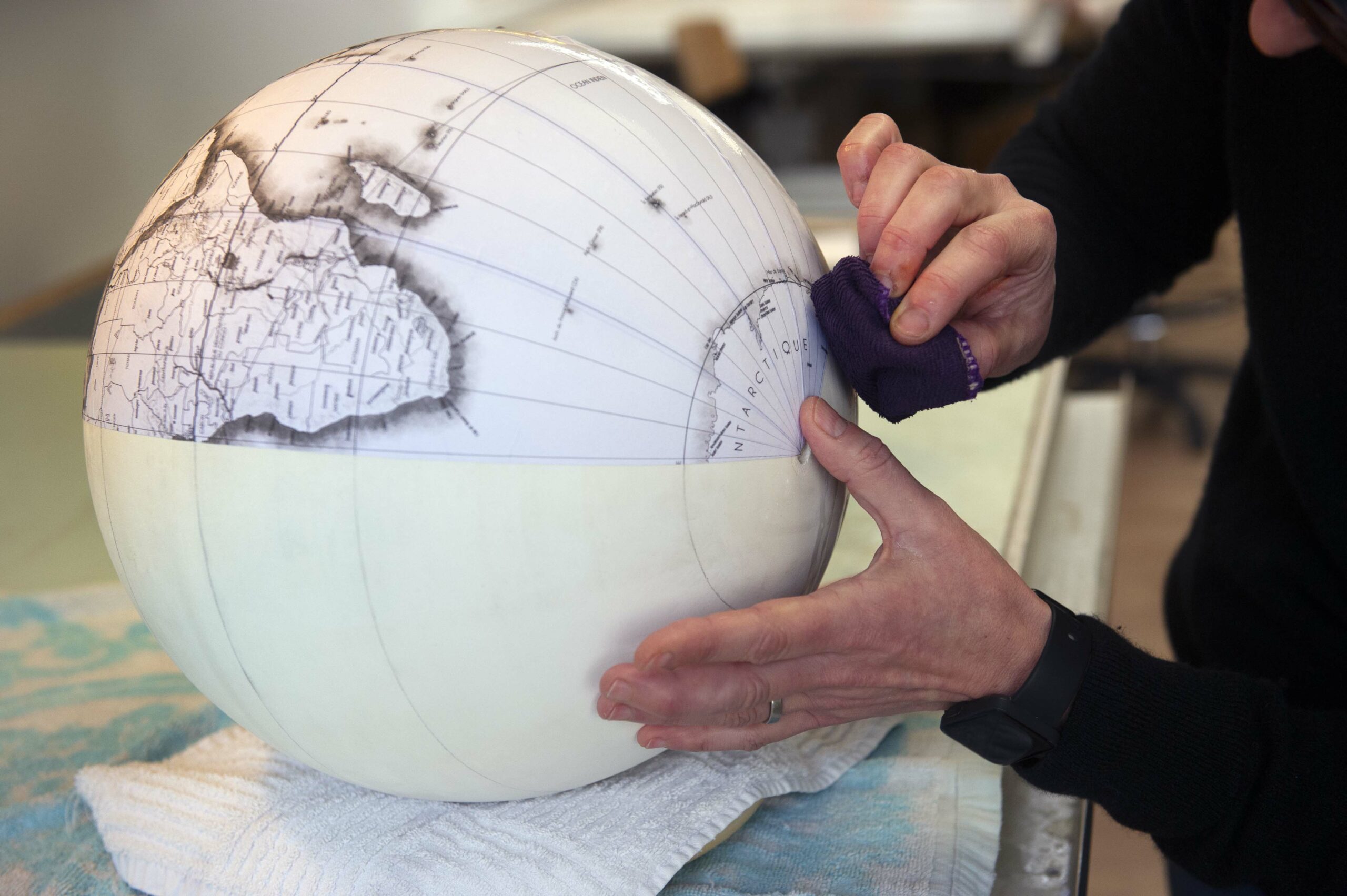 Vient ensuite la cartographie. Les cartes sont conçues par Globe Sauter & Cie, grâce aux données NaturalEarth et à la créativité de l’atelier. Après avoir poncé le plâtre, la carte imprimée et découpée en bandes -en fuseaux- est collée avec beaucoup de précision. Cette technique permet d’apposer correctement le papier, fuseau par fuseau, sur le support convexe qu’est la sphère.