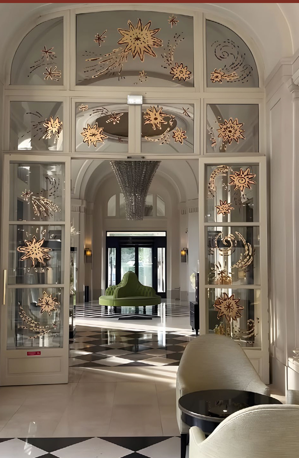 Aux côtés du créatif Arnold d’Alger, le Waldorf Astoria Versailles – Trianon Palace se pare de délicates feuilles d’or, offrant une immersion artistique inspirée du patrimoine royal. L’artiste réinterprète l’âme de Versailles en habillant les fenêtres et les espaces communs de dorures scintillantes. On y retrouve le symbole du Roi-Soleil, des fleurs et des animaux en clin d’œil aux jardins du palais, sublimés par la lumière poétique et les créations féeriques de René Veyrat. Une promenade enchantée qui transforme l’espace en véritable conte de Noël.