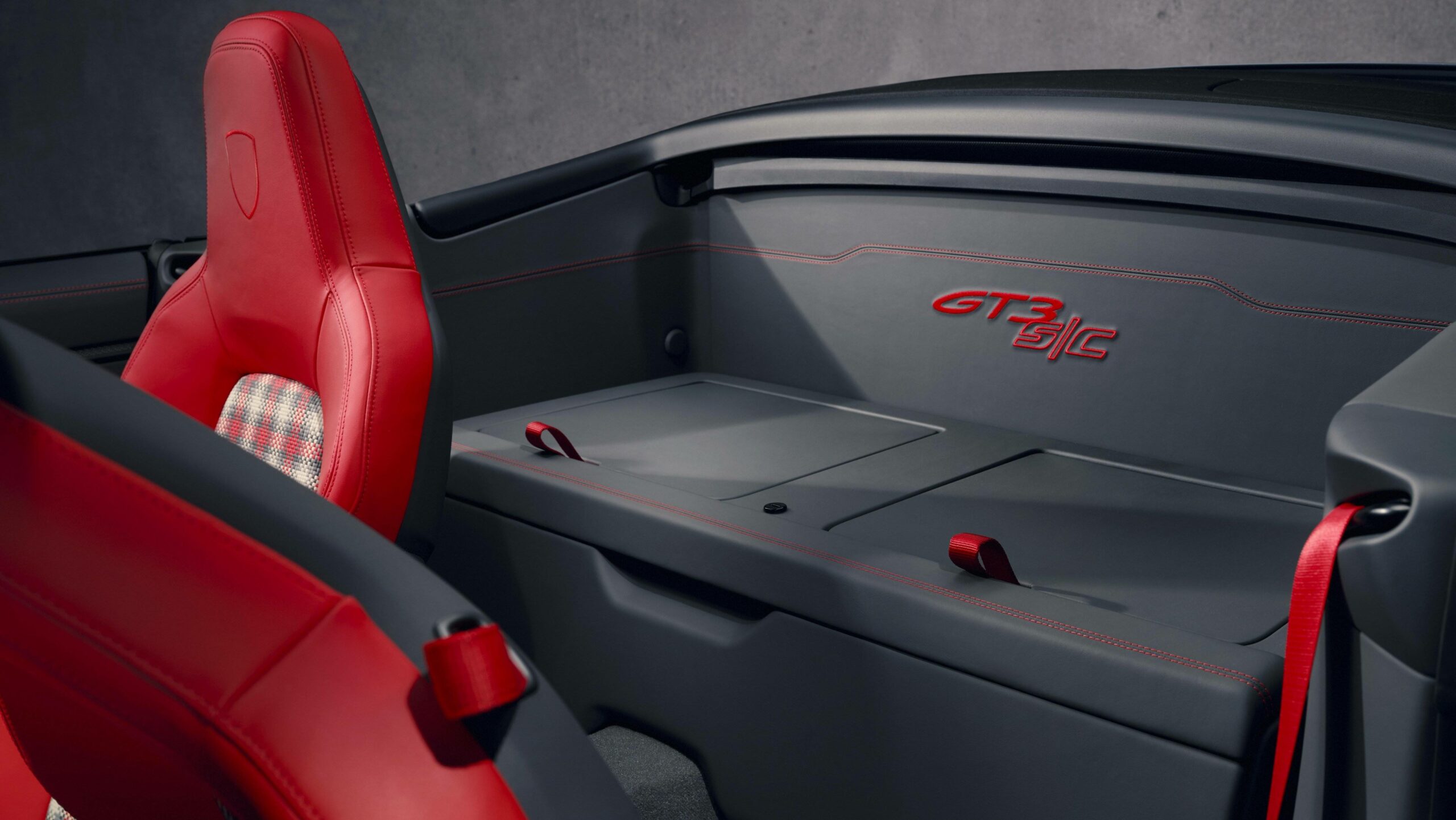 Visuellement, la 911 GT3 S/C impose une signature unique. Silhouette affûtée, lignes tendues, capote parfaitement intégrée : même fermée, elle évoque la pureté d’un coupé. L’absence d’arceaux visibles sous la toile renforce cette fluidité, tandis que les détails hérités des versions les plus radicales de la gamme affirment son caractère.