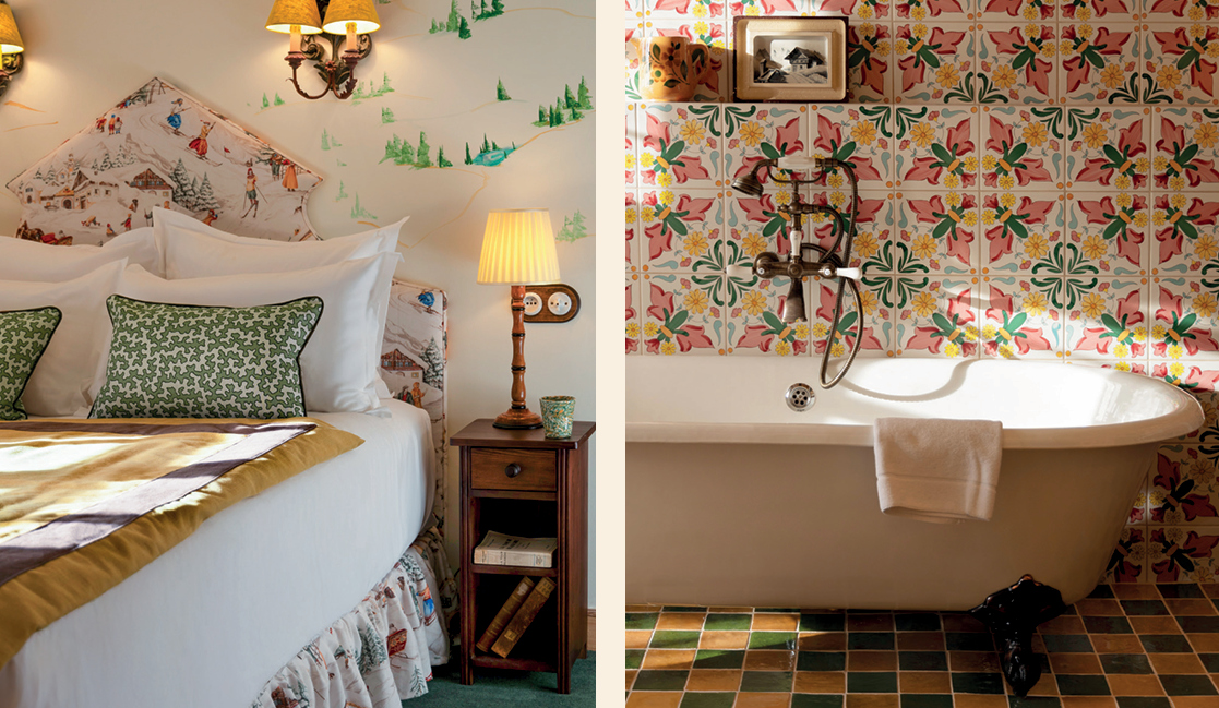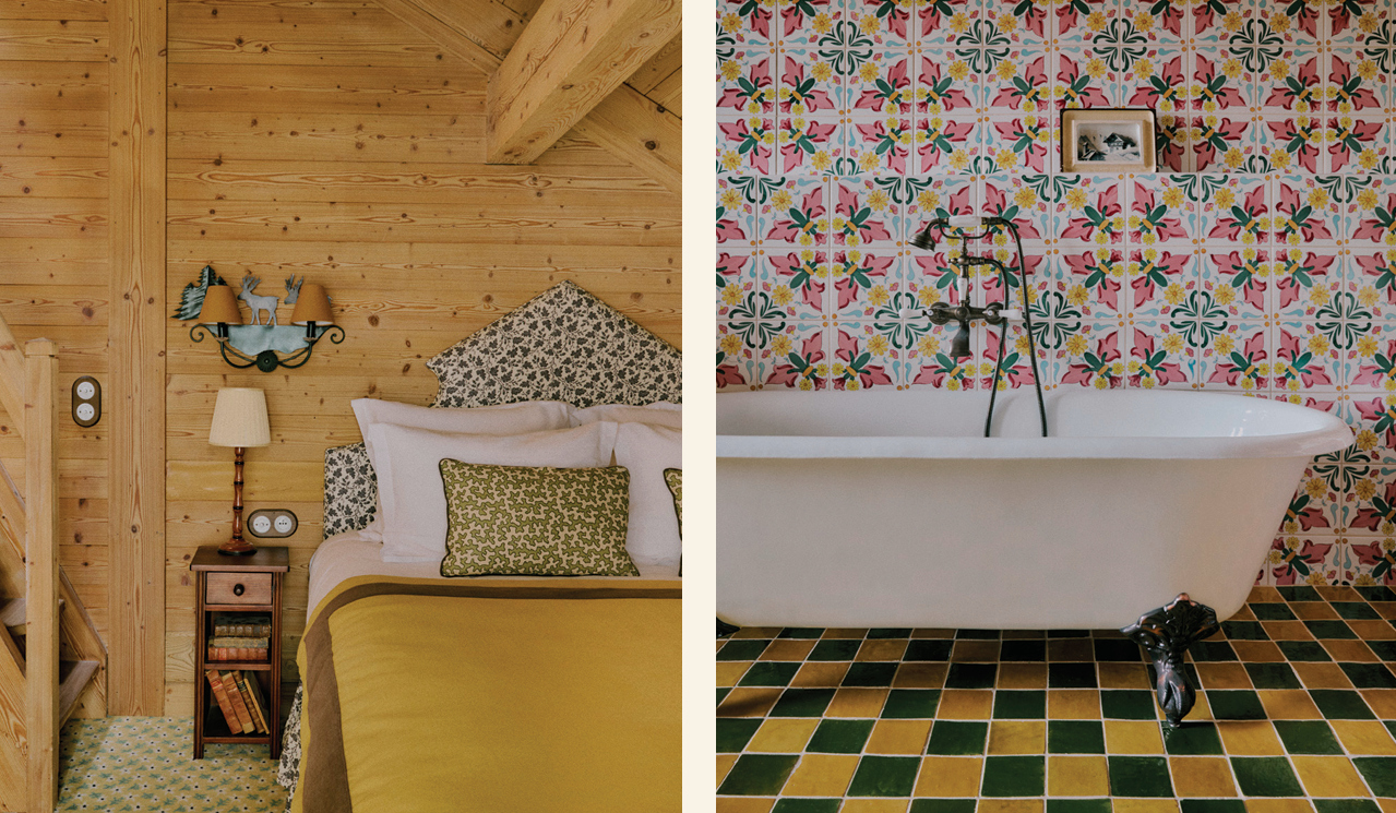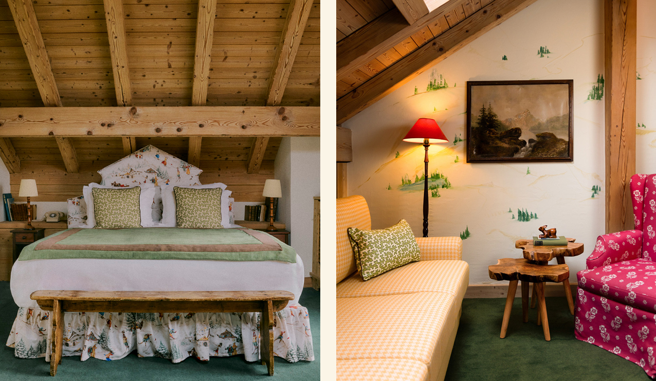 Sous les toits, les poutres dessinent de délicates ombres, tandis que les papiers peints murmurent des paysages forestiers imaginaires. Chacune des 29 chambres et 5 suites s’ouvre comme une parenthèse chromatique, habillée de tissus Pierre Frey, de têtes de lit éclatantes et de salles de bains au caractère affirmé. Le confort s’y fait cocon, avec, pour certaines, la douceur d’une climatisation et, pour toutes, un balcon invitant à contempler -parfois- la majesté du clocher ou les sommets enneigés. L’ensemble compose une atmosphère romantique et théâtrale.