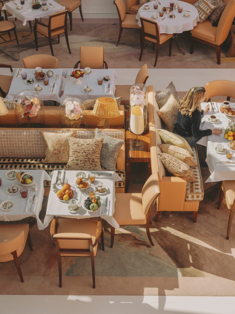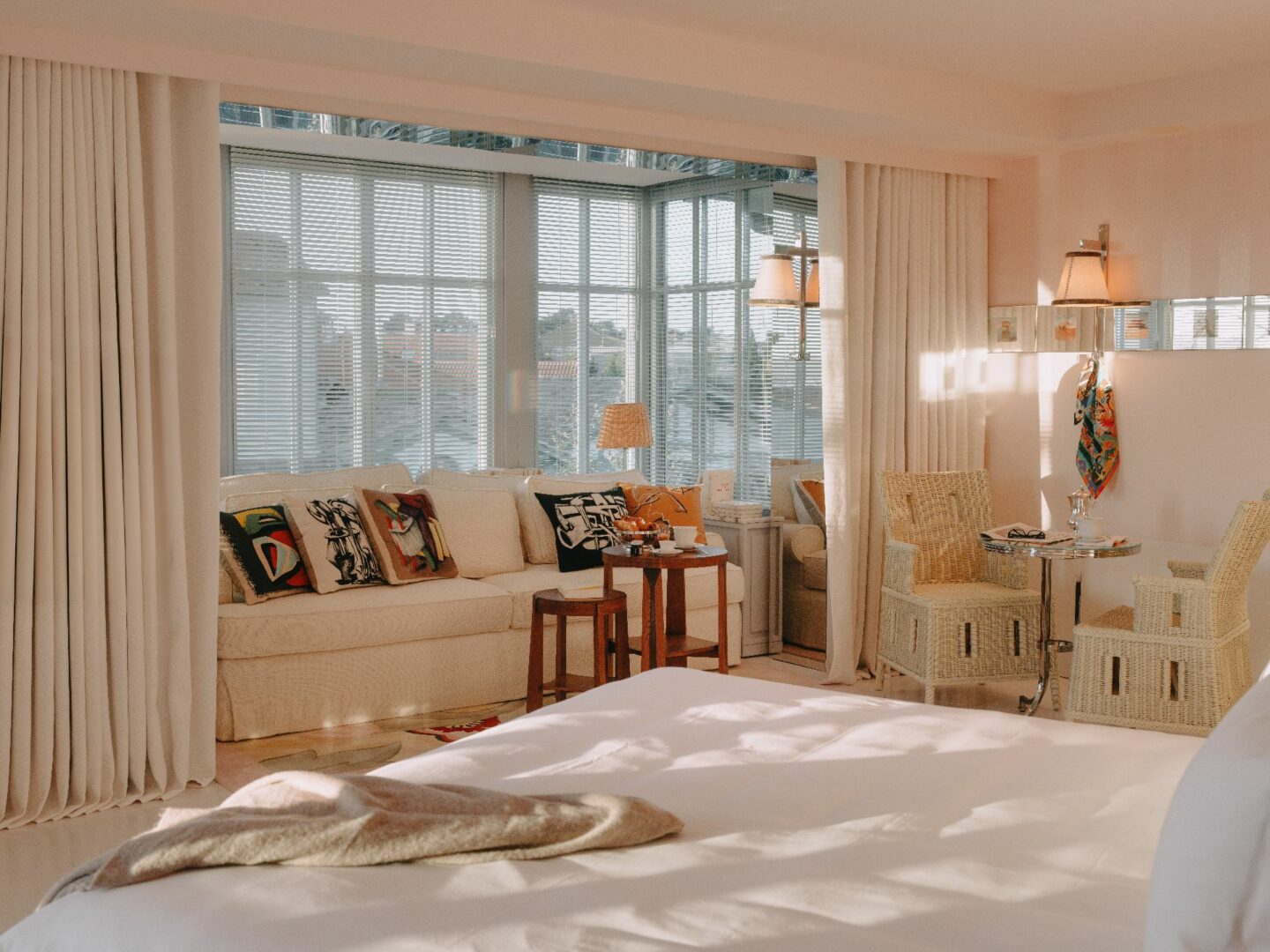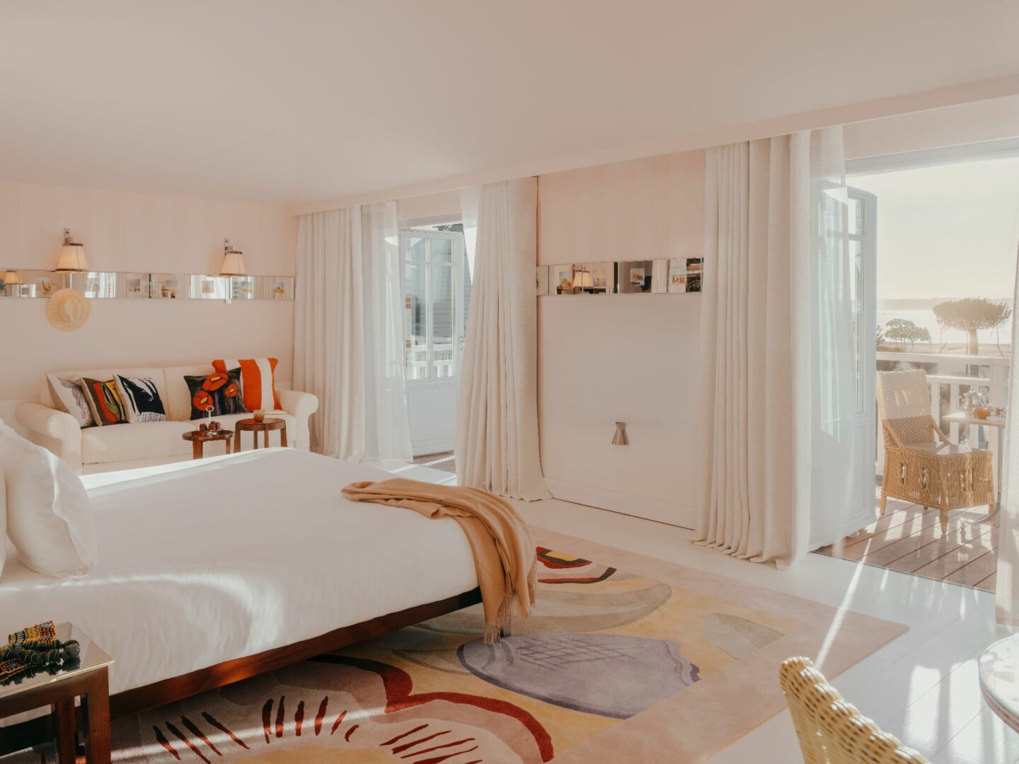 Les 28 chambres et suites prolongent cette sensation de légèreté. Teintes poudrées, bois précieux, lignes douces : tout semble flotter. Les frises photographiques, discrètement surréalistes, rappellent la signature du créateur, entre humour subtil et élégance décalée. Balcons, terrasses et jardins ouvrent le regard vers le bassin ou la pinède, comme autant d’invitations à se perdre dans le paysage.