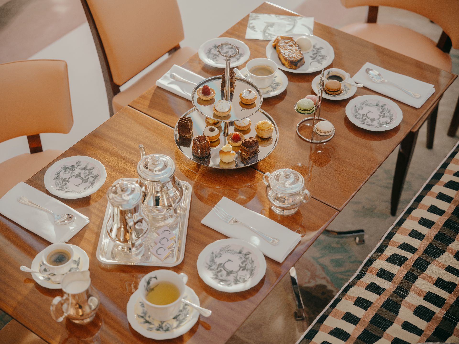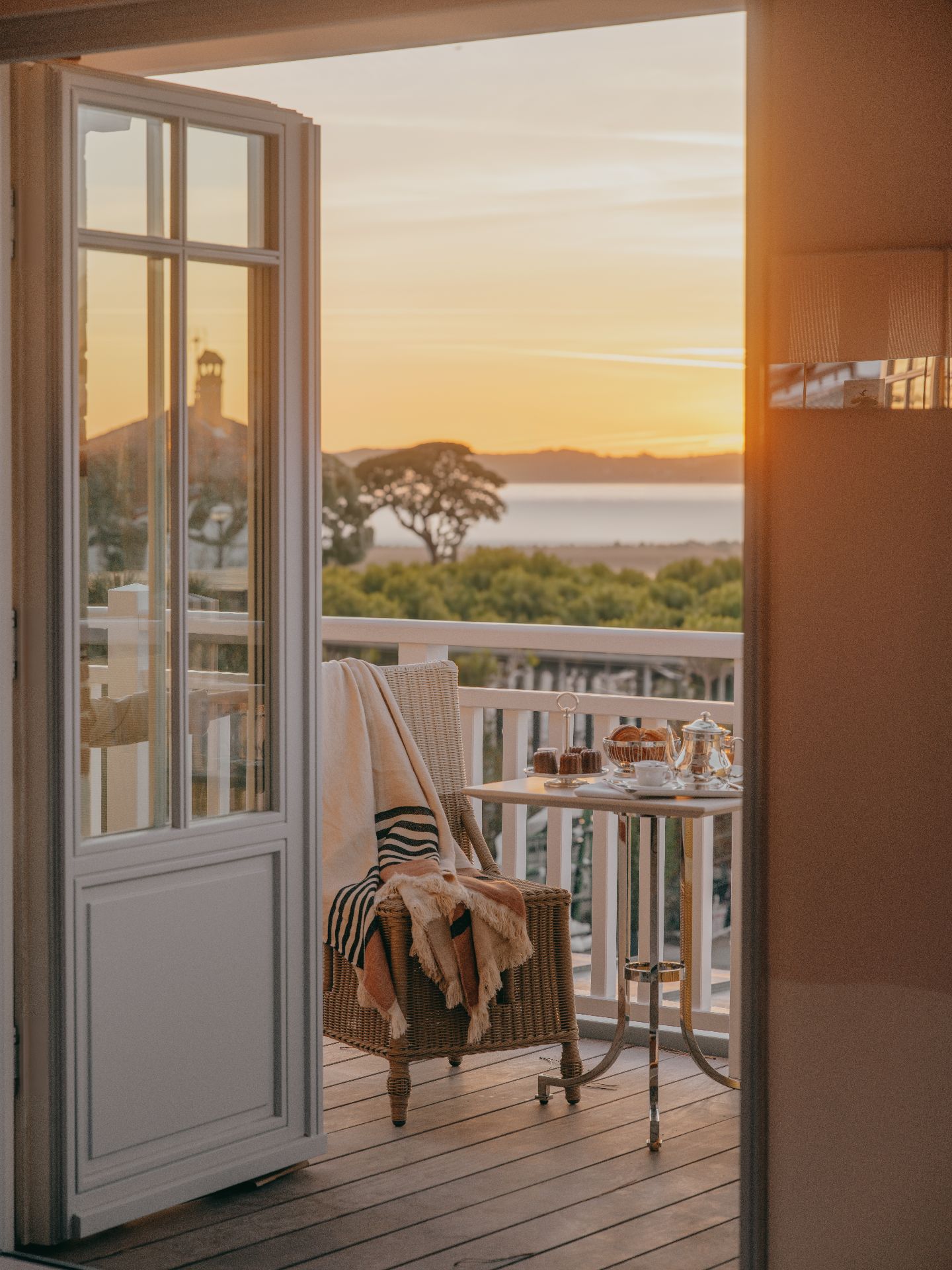 Les 28 chambres et suites prolongent cette sensation de légèreté. Teintes poudrées, bois précieux, lignes douces : tout semble flotter. Les frises photographiques, discrètement surréalistes, rappellent la signature du créateur, entre humour subtil et élégance décalée. Balcons, terrasses et jardins ouvrent le regard vers le bassin ou la pinède, comme autant d’invitations à se perdre dans le paysage.