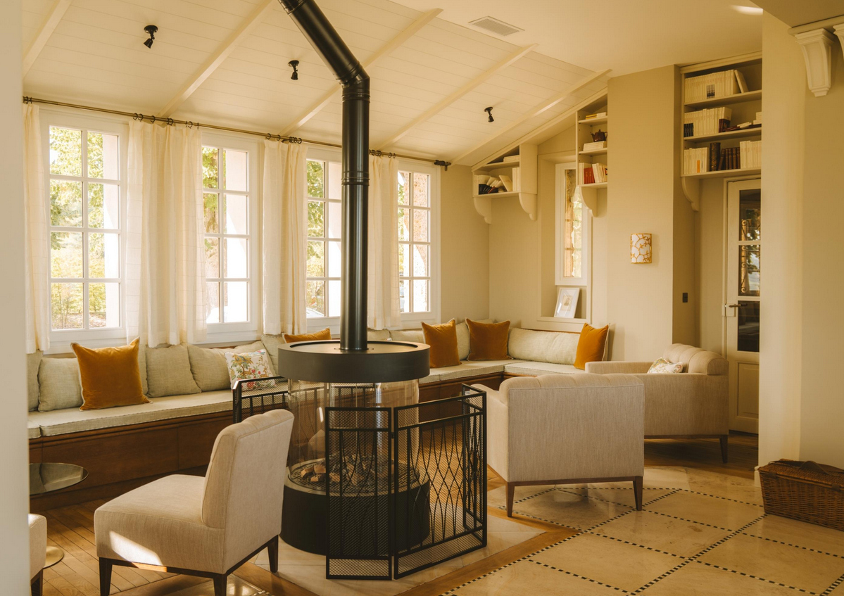 Les espaces de vie partagés participent à cette continuité sensorielle. Le salon principal, centré autour de la cheminée, accueille les saisons et les instants suspendus. Il devient tour à tour lieu de lecture, de conversation ou de silence.