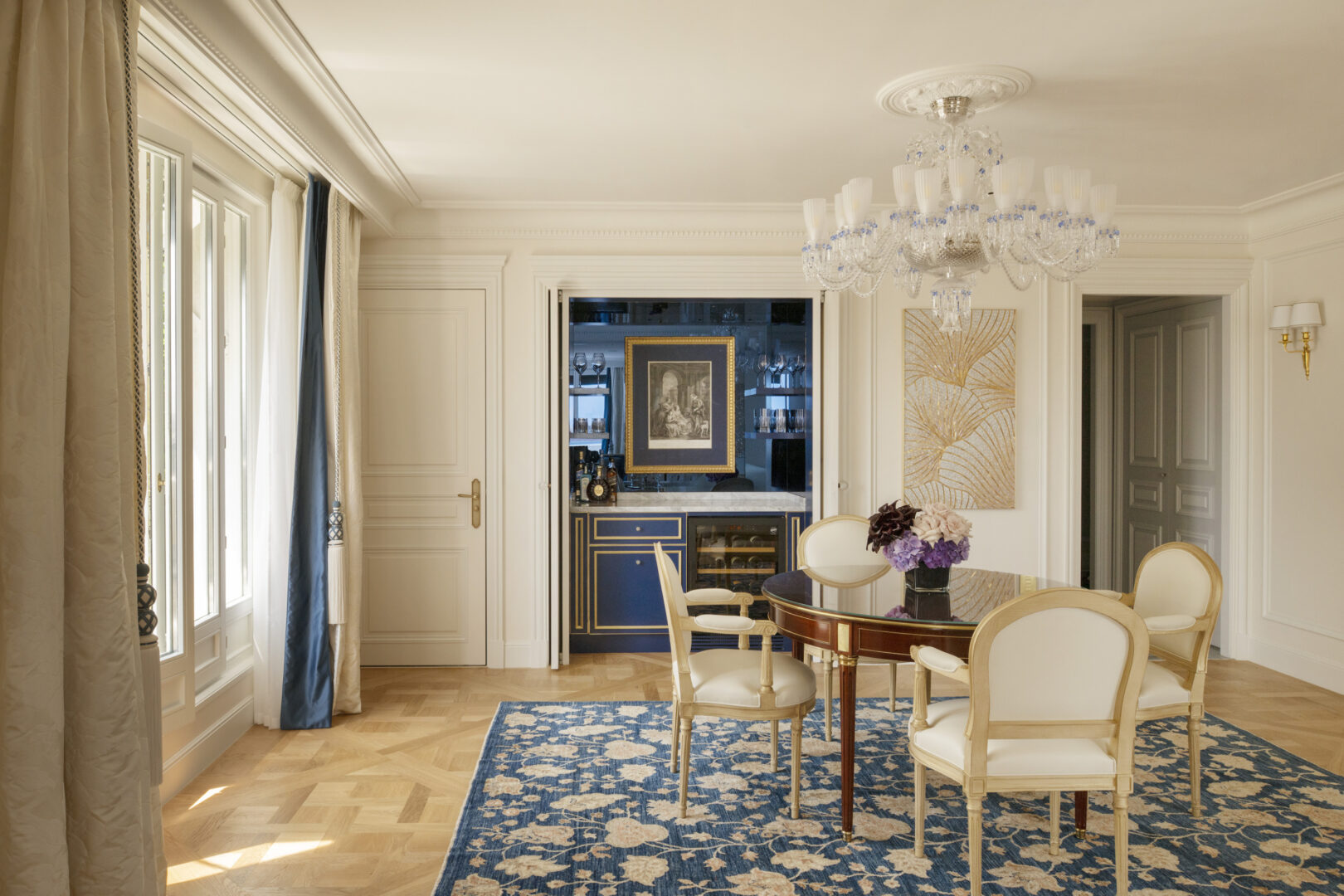 Enfin, la Suite Parisienne incarne un luxe discret et personnel, où la sobriété se mêle à l’élégance. Conçue comme un intérieur apaisé et lumineux, elle offre une nouvelle lecture résidentielle fluide et harmonieuse. Dès l’entrée, une bibliothèque semi-ouverte instaure une atmosphère de lieu habité. Le salon, aux proportions classiques, s’enrichit d’une touche contemporaine avec un bar laqué vert émeraude et un mobilier restauré avec finesse. L’ensemble se distingue par une palette délicate de vert d’eau, d’ivoire et de taupe clair, rehaussée de dorures patinées et d’œuvres d’art signées Gérard Redoules. La salle de bains en marbre de Carrare, sublimée par des robinetteries Baccarat et des appliques Lalique, s’ouvre sur un dressing semi-transparent abritant une coiffeuse évoquant un boudoir de théâtre. Ce décor raffiné, tout en nuances et en lumière, célèbre un art du luxe intime et silencieux, où chaque détail contribue à une sensation de calme et de beauté intemporelle.