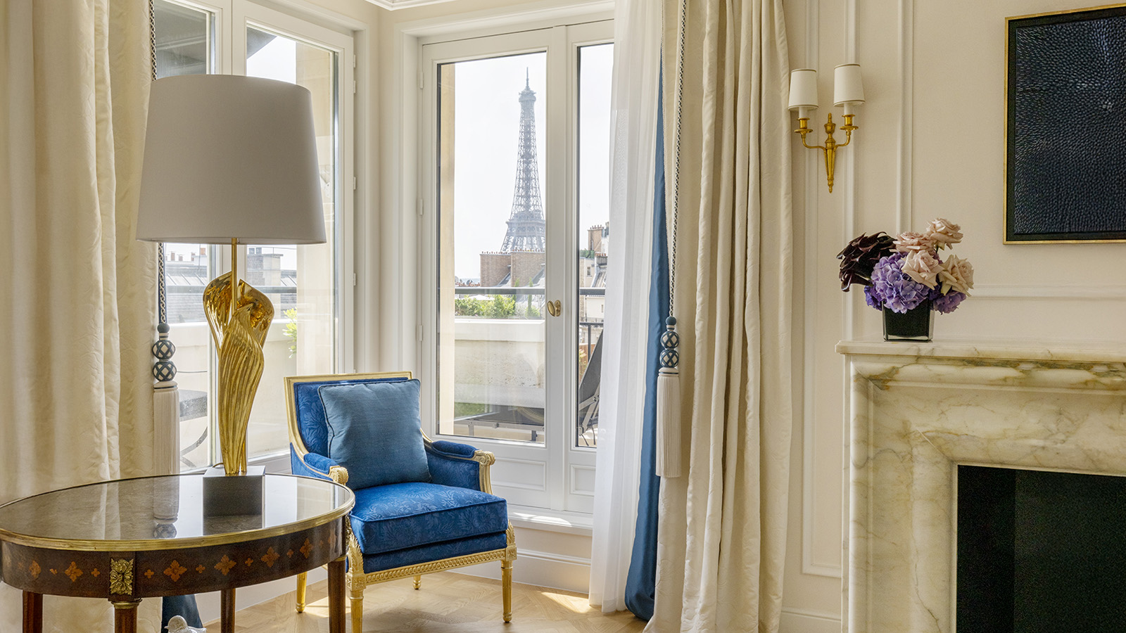 Nouvelle suite signature du George V, la Suite Parisienne Eiffel a été conçue comme un élégant appartement familial alliant confort, intimité et raffinement. Sa configuration exceptionnelle -une suite principale prolongée de deux chambres communicantes- permet d’accueillir familles ou résidents de longue durée dans une atmosphère à la fois chaleureuse et sophistiquée. Reconfigurés pour plus de fluidité et baignés de lumière naturelle, les espaces s’ouvrent sur un balcon et deux terrasses paysagées offrant une vue spectaculaire sur la Tour Eiffel. Autour d’une cheminée en marbre Calacatta Oro, le décor célèbre l’art de vivre à la française : parquet Versailles en chêne patiné, draperies raffinées, tapis faits main et palette douce de bleu et blanc cassé. La salle de bains, en marbre de Carrare, s’orne de robinetteries Baccarat et d’appliques Lalique, tandis que le dressing-boudoir, orné d’une coiffeuse en verre gravé de Murano, prolonge cette atmosphère de luxe discret. Les chambres attenantes, décorées dans les mêmes tons et matériaux nobles, assurent une continuité harmonieuse et élégante à cet écrin parisien d’exception.