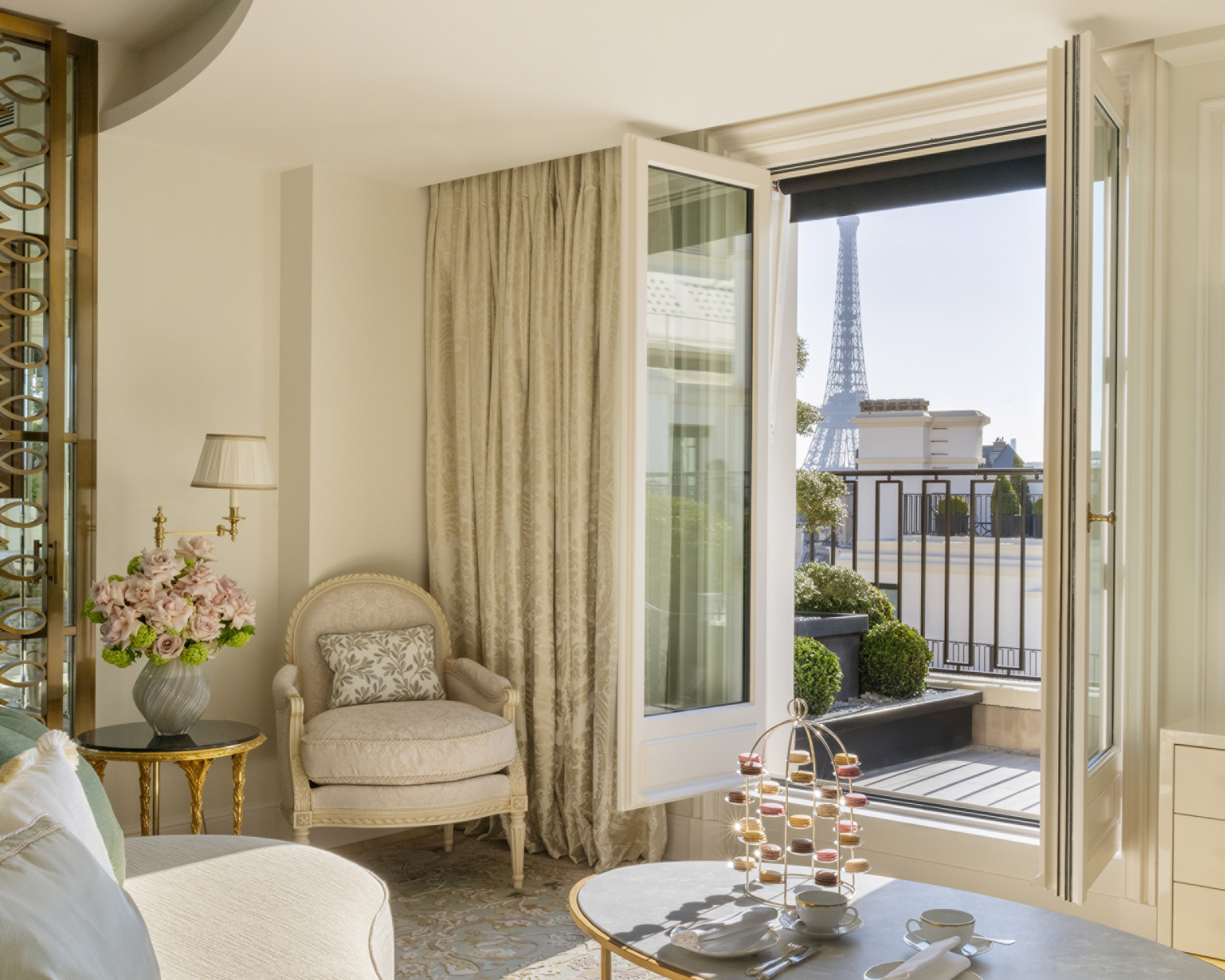 Située au dernier étage, la Suite Penthouse incarne le raffinement absolu de l’hôtel. Repensée pour laisser entrer la lumière naturelle, elle conserve son esprit de refuge luxueux tout en offrant une conception plus fluide et poétique. Chaque détail participe à l’expérience : canapé en soie chenille verte J. Robert Scott, bibliothèque circulaire laquée ivoire au décor végétal, plafond à la feuille d’or patinée, dressing façon boudoir orné d’appliques Baccarat et vasques en marbre sculpté agrémentées de créations florales signées Jeff Leatham. Ses trois terrasses privées offrent une vue panoramique sur Paris, où, à la nuit tombée, le scintillement de la Tour Eiffel parachève la magie de ce havre d’élégance.