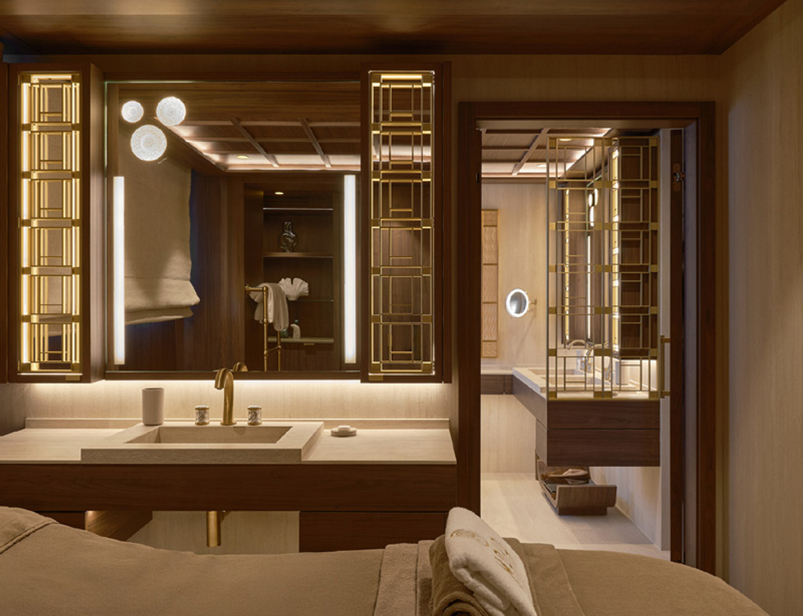 Du sol au plafond, le bois sculpté avec finesse ponctue les espaces, insufflant une chaleur artisanale et une identité forte. Il se marie à d’autres matériaux plus sophistiqués, comme le marbre, le métal ou le cristal. Les suspensions Lalique, présentes aussi dans le restaurant, accentuent la sensation d’apesanteur. D’autres détails évocateurs, comme les célèbres kokeshi, inscrivent le restaurant dans un imaginaire singulier.