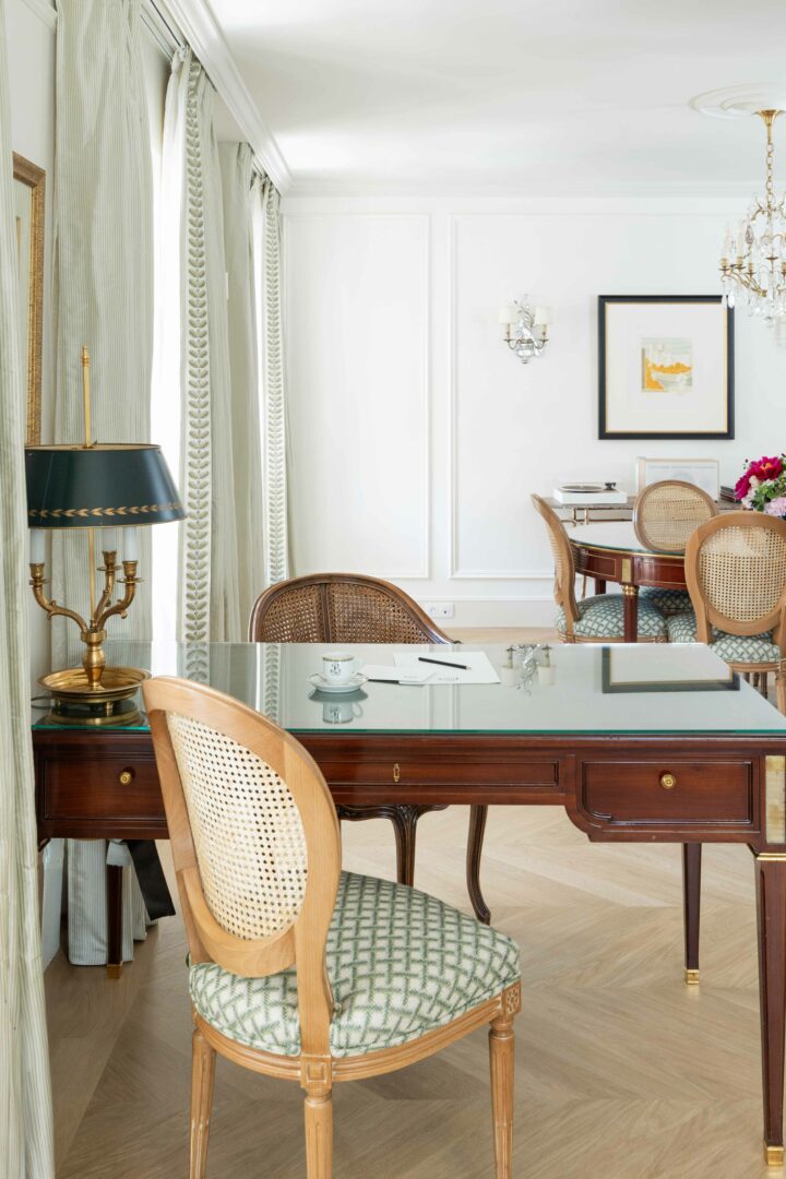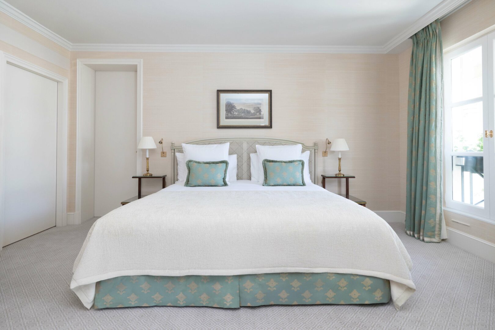 Une palette harmonieuse craie et de verts habille les espaces de vie de la Suite Eden en faisant écho au jardin extérieur : des rideaux texturés de la Maison Schumacher et Braquenié aux coussins signés Pierre Frey, en passant par l’assise soyeuse d’un canapé Clarence House piqué de feuillages stylisés.