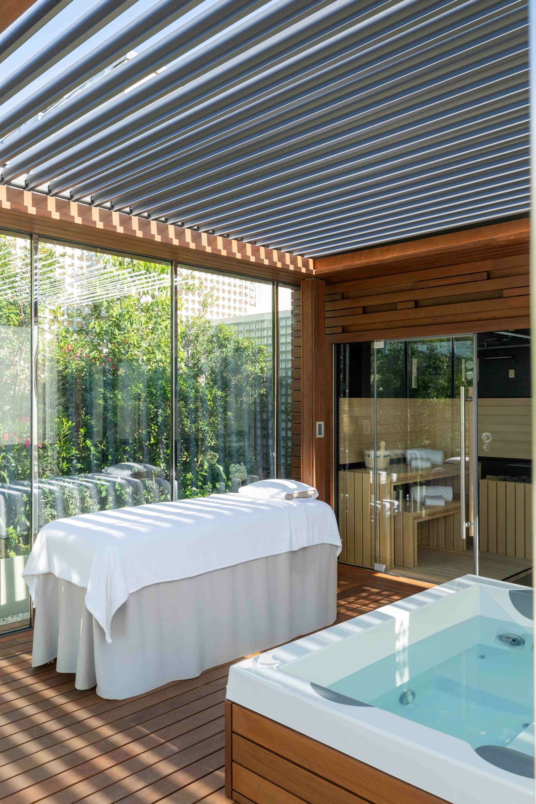 Le secret le mieux gardé de cet appartement d’exception ? La Suite Eden s’ouvre sur une vaste terrasse arborée de 150 m², véritable jardin suspendu au sommet de l’hôtel. Cet appartement d’exception de 110m² offre un espace wellness privatif dissimulé dans un cube de verre enveloppé de verdure, qui accueille hammam, sauna, douche, jacuzzi et table de massage, accessibles à toute heure du jour ou de la nuit, pour une expérience de déconnexion absolue. La promesse d’un moment hors du temps, à vivre selon son propre rythme.