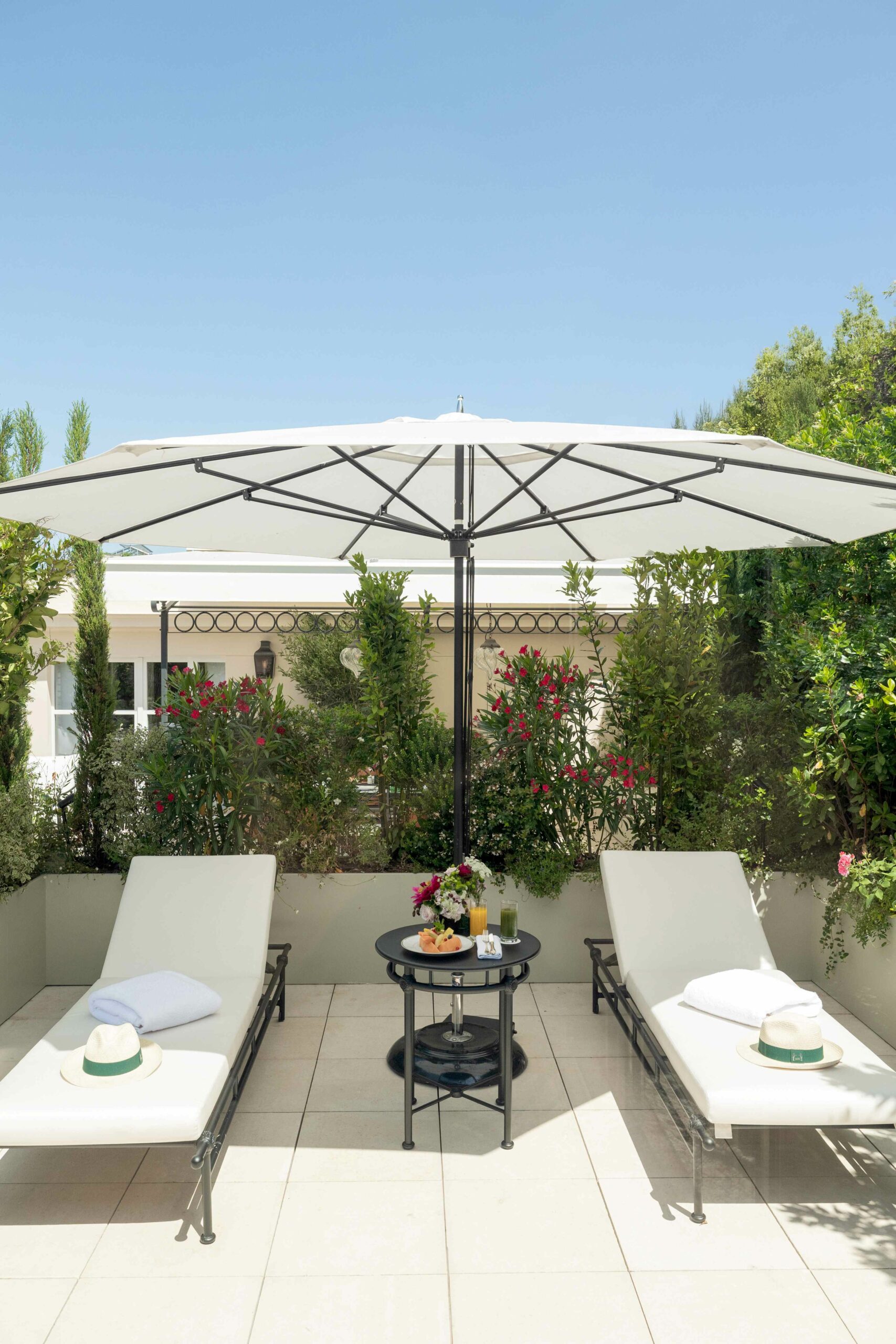 Une palette harmonieuse craie et de verts habille les espaces de vie de la Suite Eden en faisant écho au jardin extérieur : des rideaux texturés de la Maison Schumacher et Braquenié aux coussins signés Pierre Frey, en passant par l’assise soyeuse d’un canapé Clarence House piqué de feuillages stylisés.