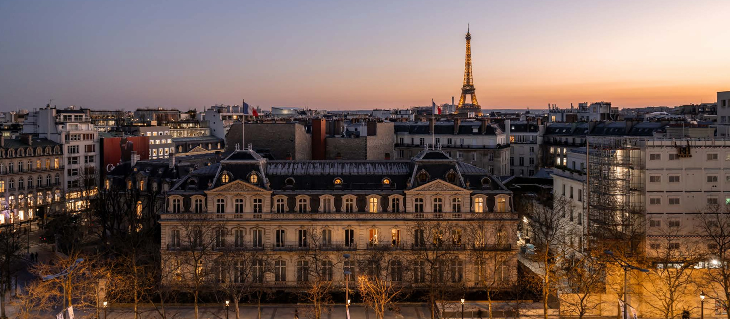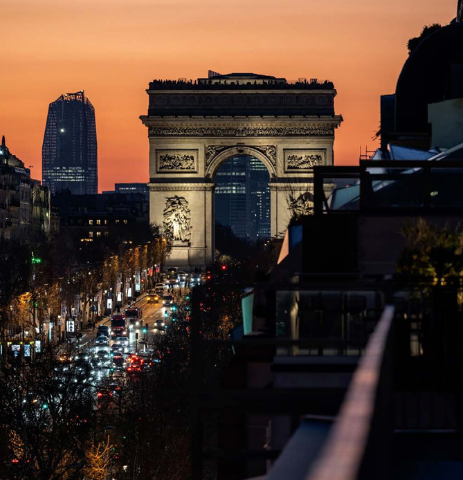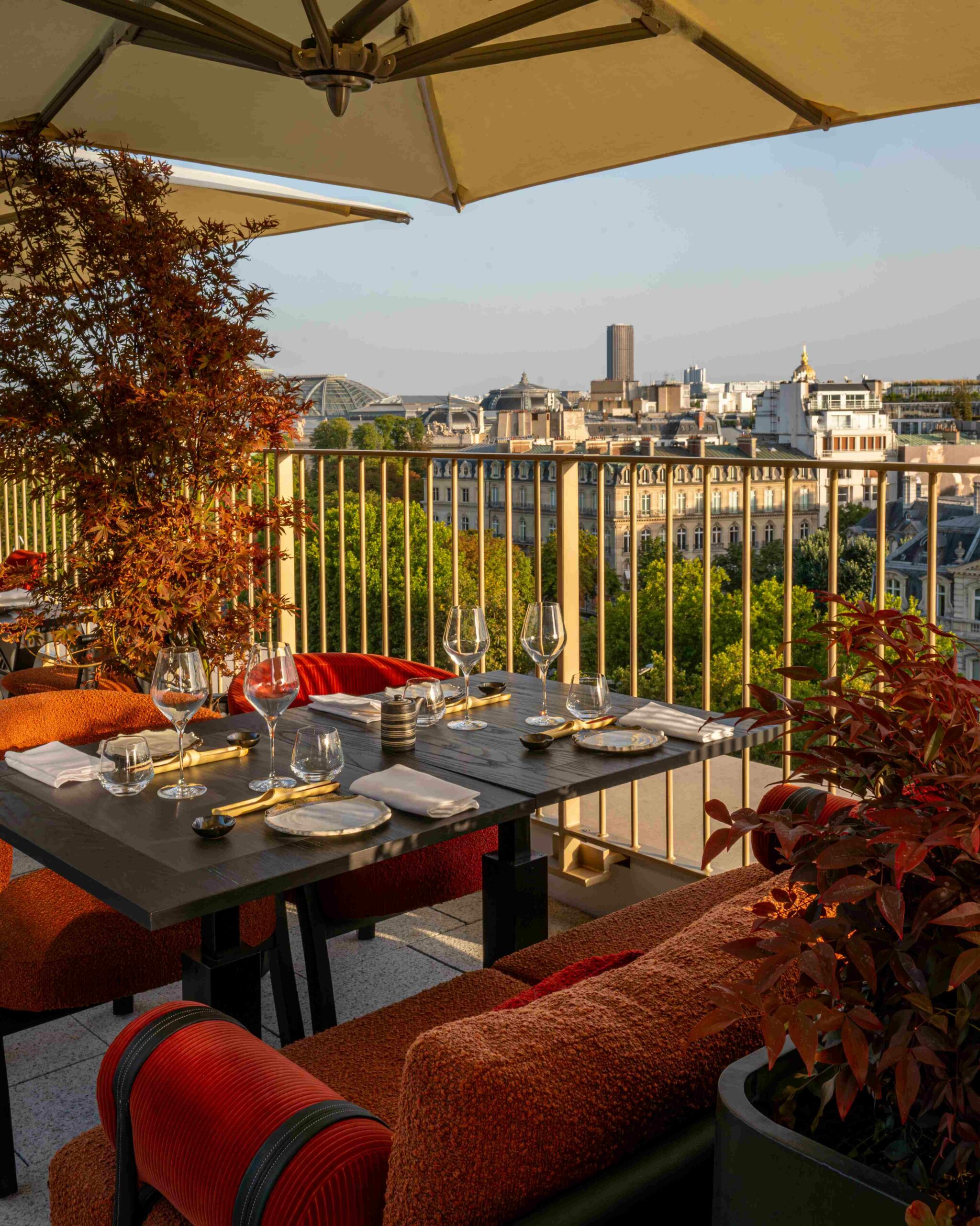 Enfin, la pièce maîtresse : la terrasse rooftop. Derrière de larges baies vitrées, elle offre une vue panoramique sur Paris : La Tour Eiffel, l’Arc de Triomphe, le Grand Palais…