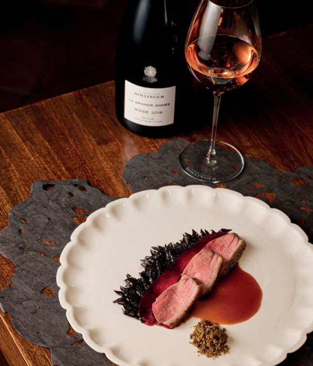 Accords : Carpaccio de filet de bœuf, huile d’olive noire, basilic rouge, baies de goji, poivre et sel rose. Queue de homard grillée, flambée de Cognac, sauce civet, riz rouge à l’ail noir. Suprême de canard à l’orange sanguine et zeste, Pont Neuf de patates douces au piment d’Espelette. Époisses farci à la truffe, vieille Mimolette. Figues rôties au miel et poivre rose, marmelade mûre, cassis et myrtille.