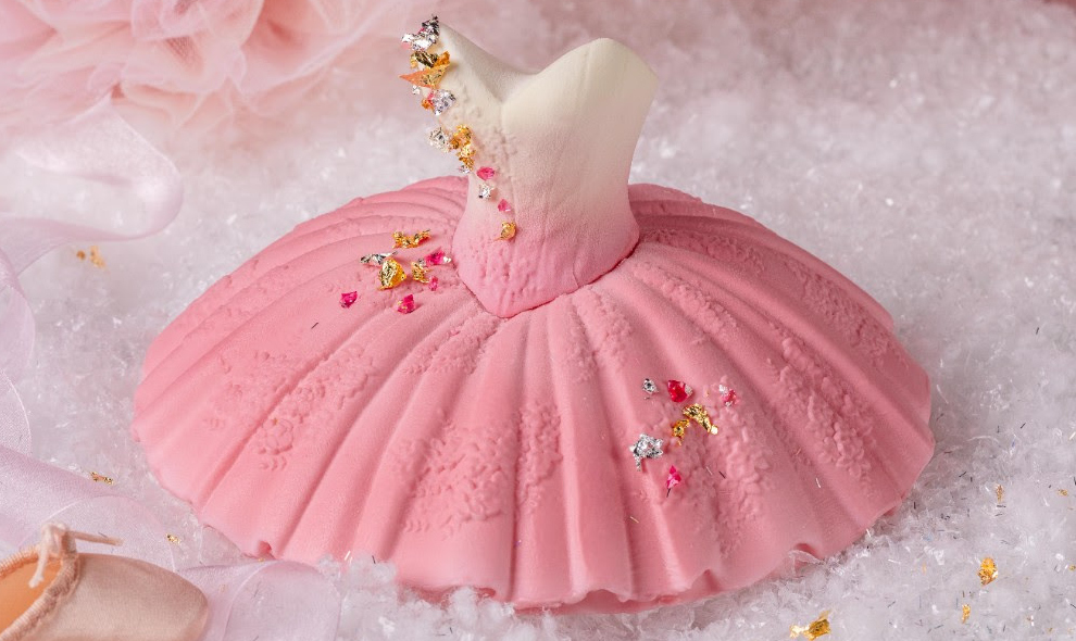 Imaginée par le chef Pâtissier Simon Letaillieur, L’Adage à la rose s’inspire du célèbre moment du ballet La Belle au bois dormant, où la princesse Aurore, entourée de ses prétendants, danse avec une rose dans les mains. Ce tutu emblématique, issu des archives de la Maison Repetto, devient ici un costume pâtissier, façonné comme un bijou éphémère. Tulle, plis, soie ?
