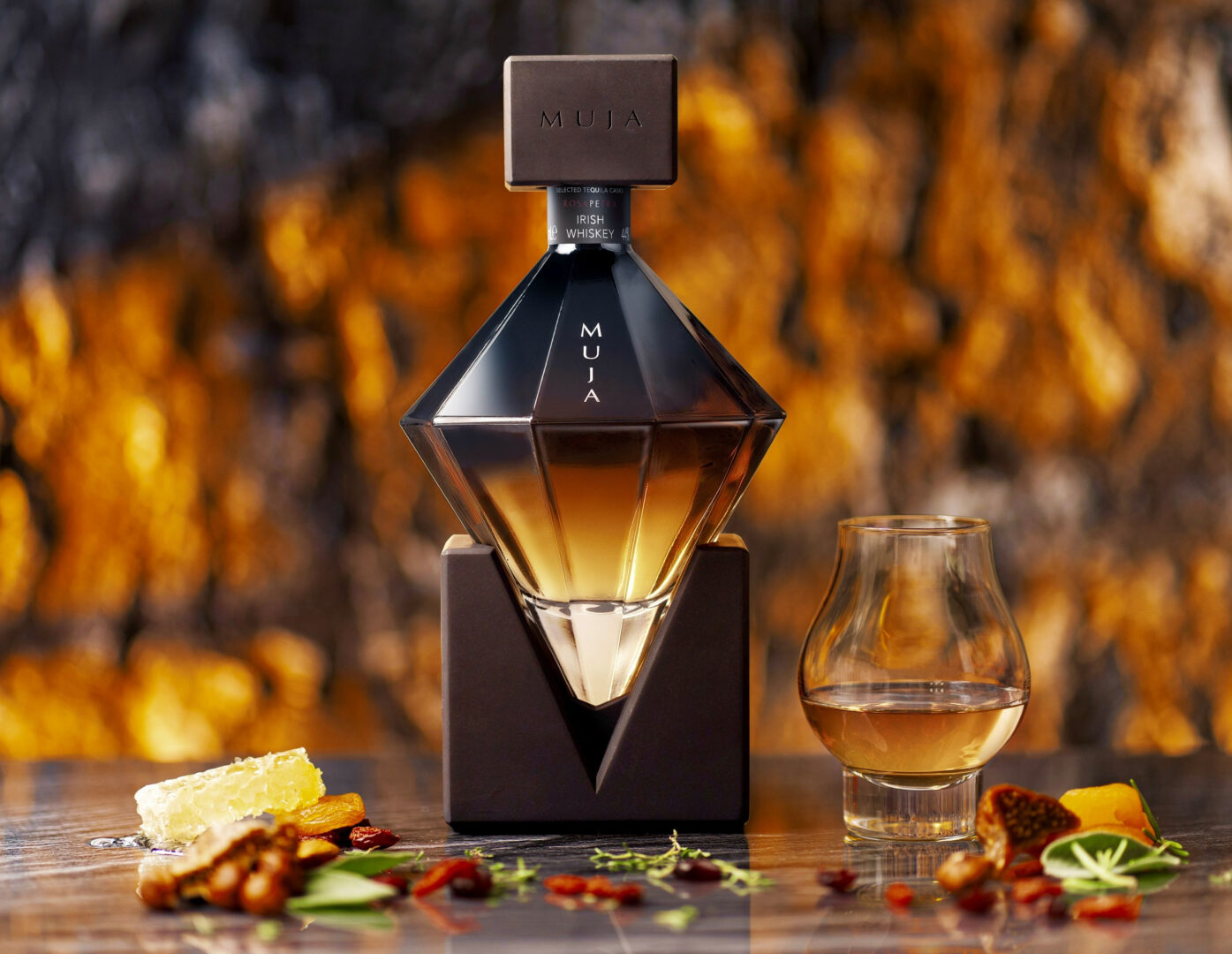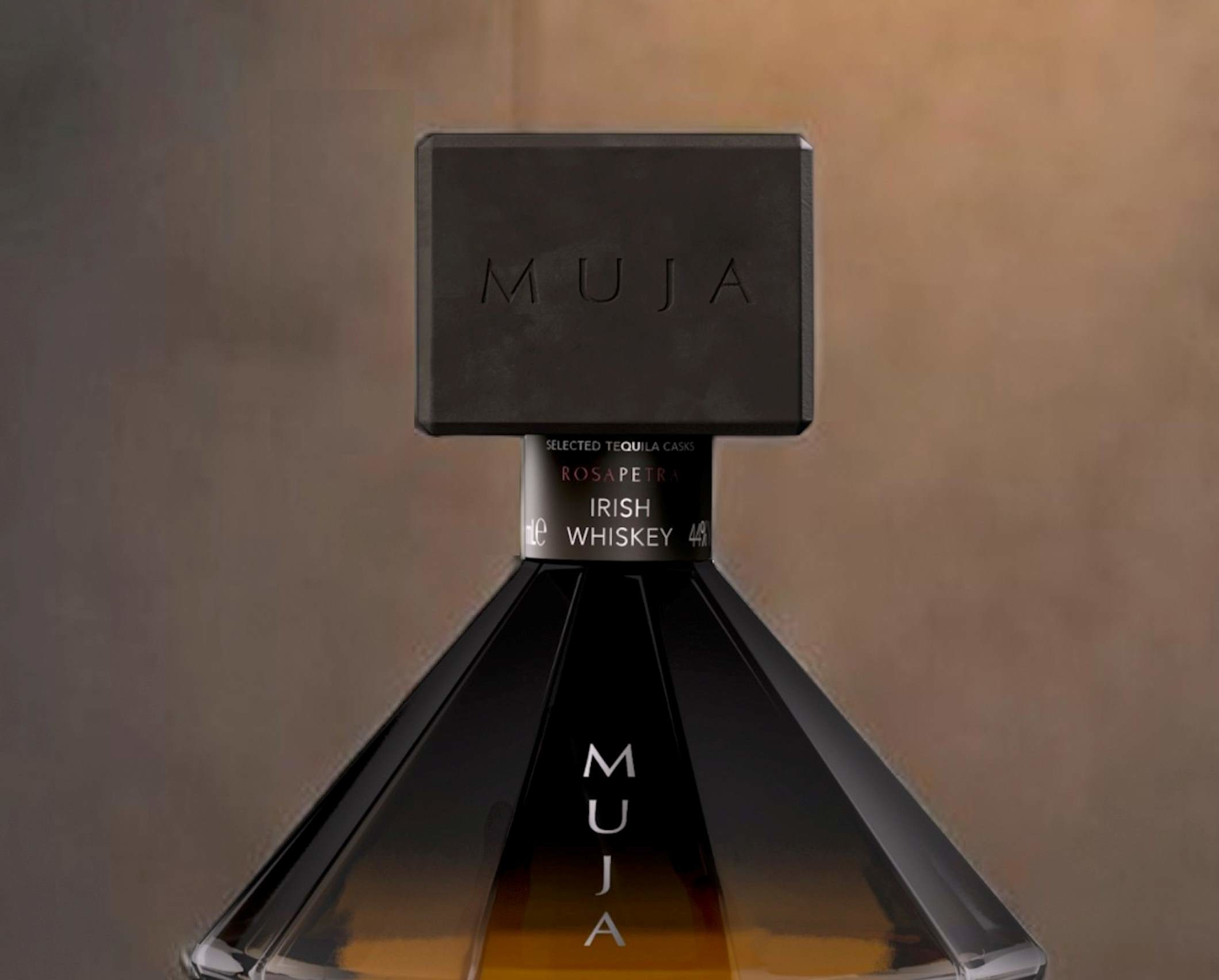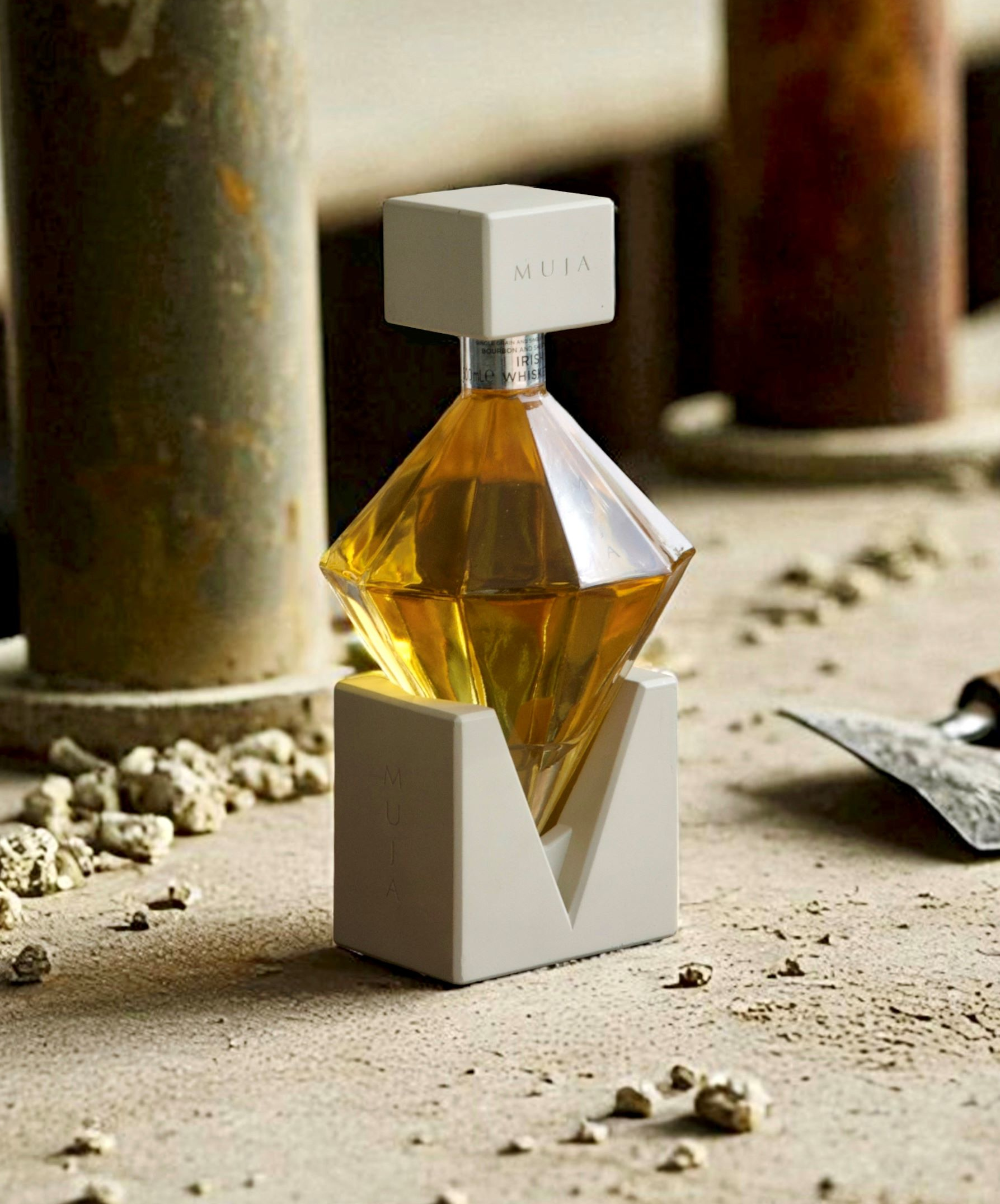 Muja est un whisky irlandais qui réinvente les codes du spiritueux. Sa bouteille, sculptée comme un diamant et associant le béton brut à un verre lisse et massif, surprend par sa force et son élégance, tout en révélant la douceur du whisky qu’elle contient.