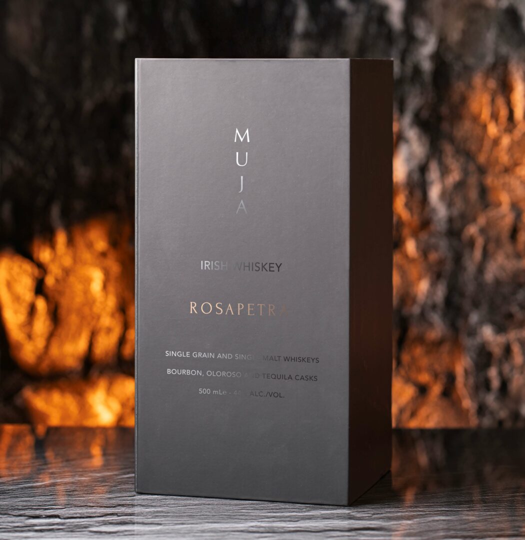 Muja Irish Whiskey Rosapetra est la dernière création artistique de la distillerie, audacieuse, partiellement vieillie en fûts de tequila pour révéler un caractère riche, complexe et subtilement doux. Sa bouteille fumée, en forme de diamant noir avec base et bouchon en béton, allie artisanat et design contemporain pour un résultat élégant et unique. Chaque détail est pensé pour sublimer l’expérience : matériaux d’exception, finition faite à la main et coffret cadeau haut de gamme font de Rosapetra bien plus qu’un whisky, un véritable objet de collection pour les amateurs de whisky et les passionnés de design.