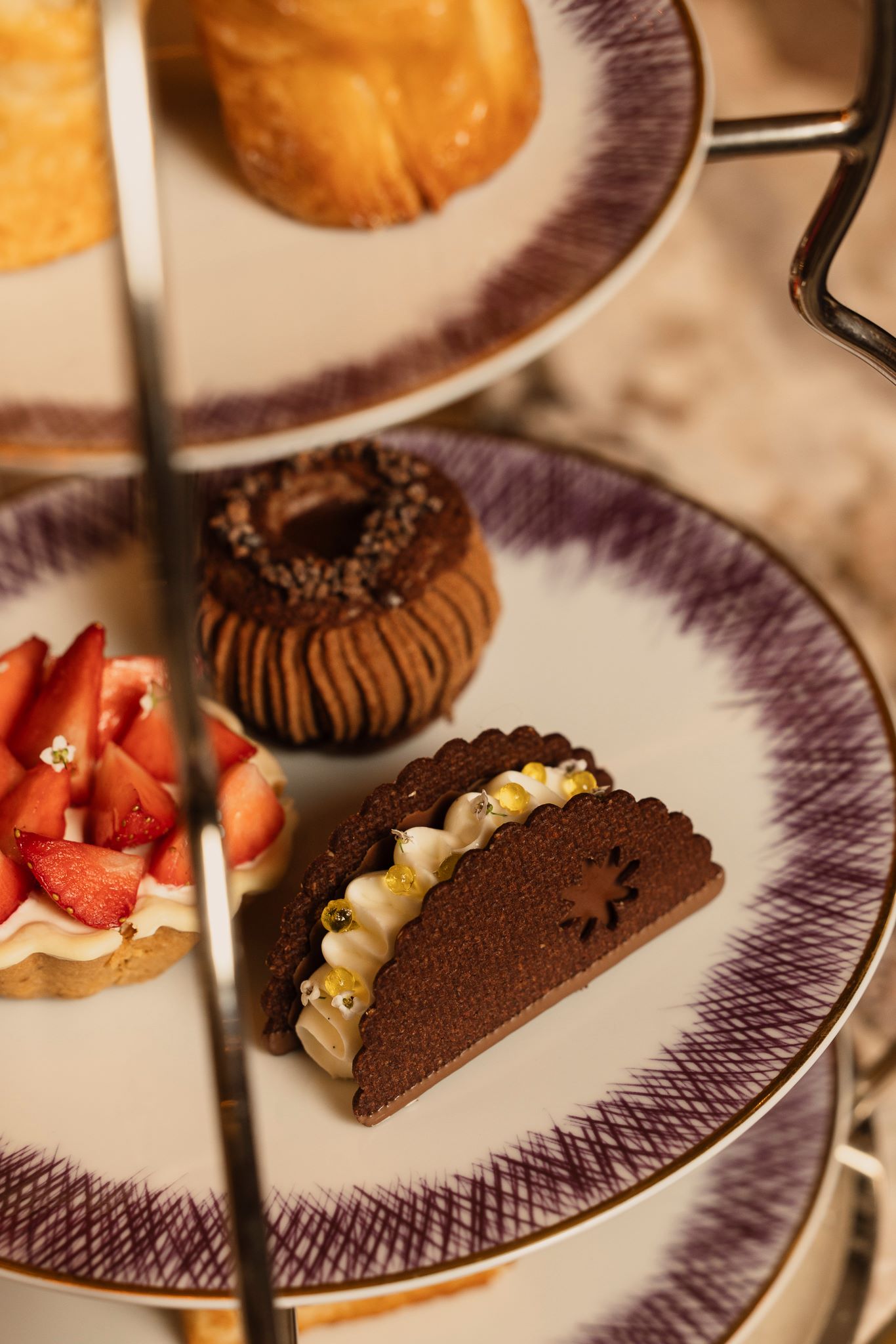 Le Chef Matthieu Carlin transforme le chocolat en objet d’art avec une création inspirée du célèbre lampadaire de la Place de la Concorde. Cette pièce unique, à la fois décorative et délicieuse, rend hommage à l’élégance intemporelle du patrimoine parisien tout en s’intégrant parfaitement à l’atmosphère majestueuse du Hôtel de Crillon. Une œuvre où histoire, architecture et savoir-faire pâtissier se rencontrent pour offrir une expérience sensorielle et visuelle d’exception.