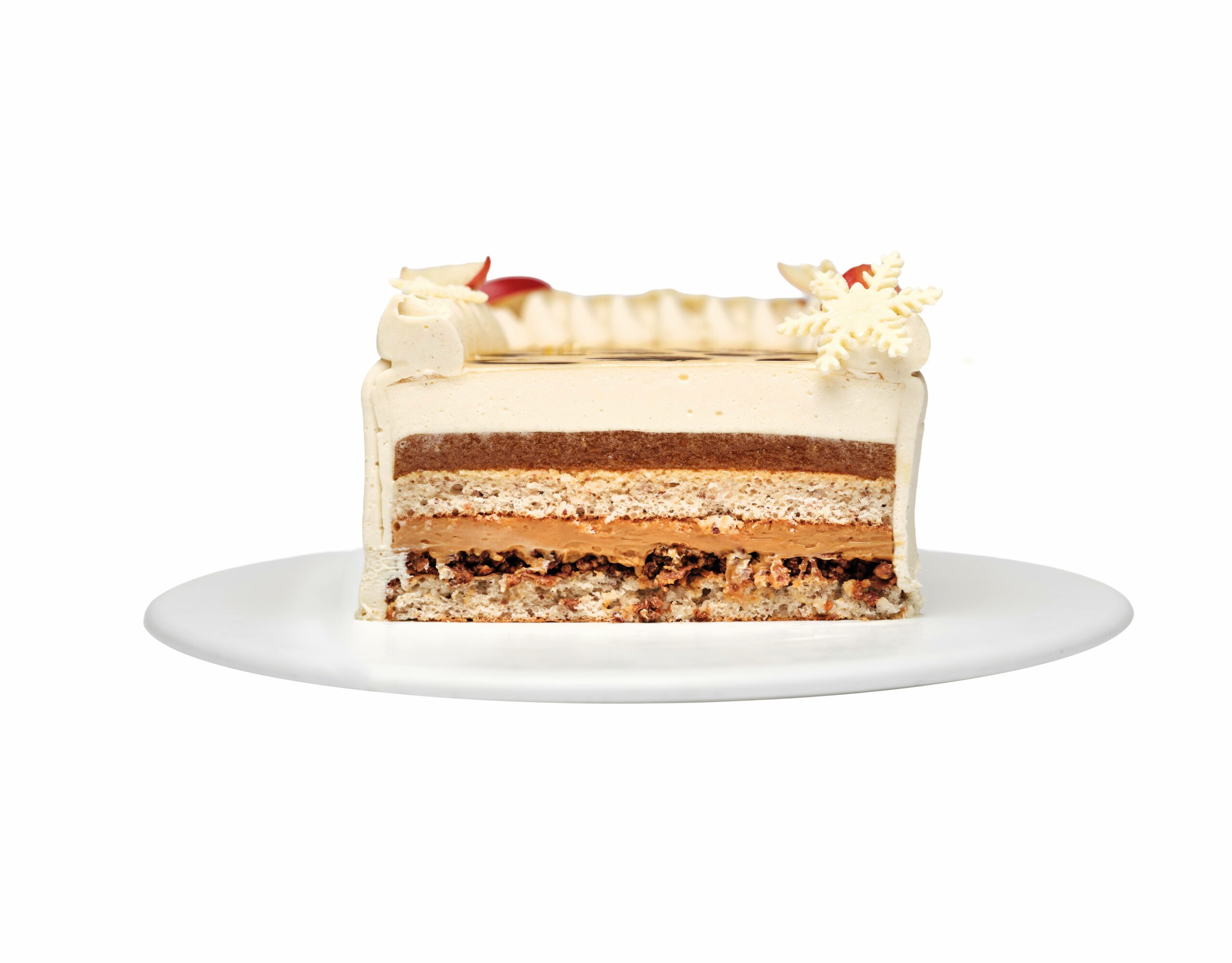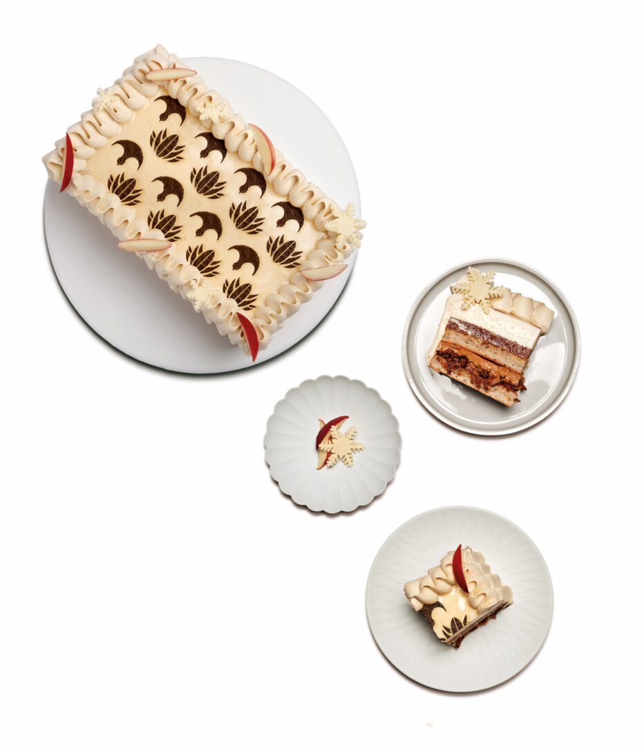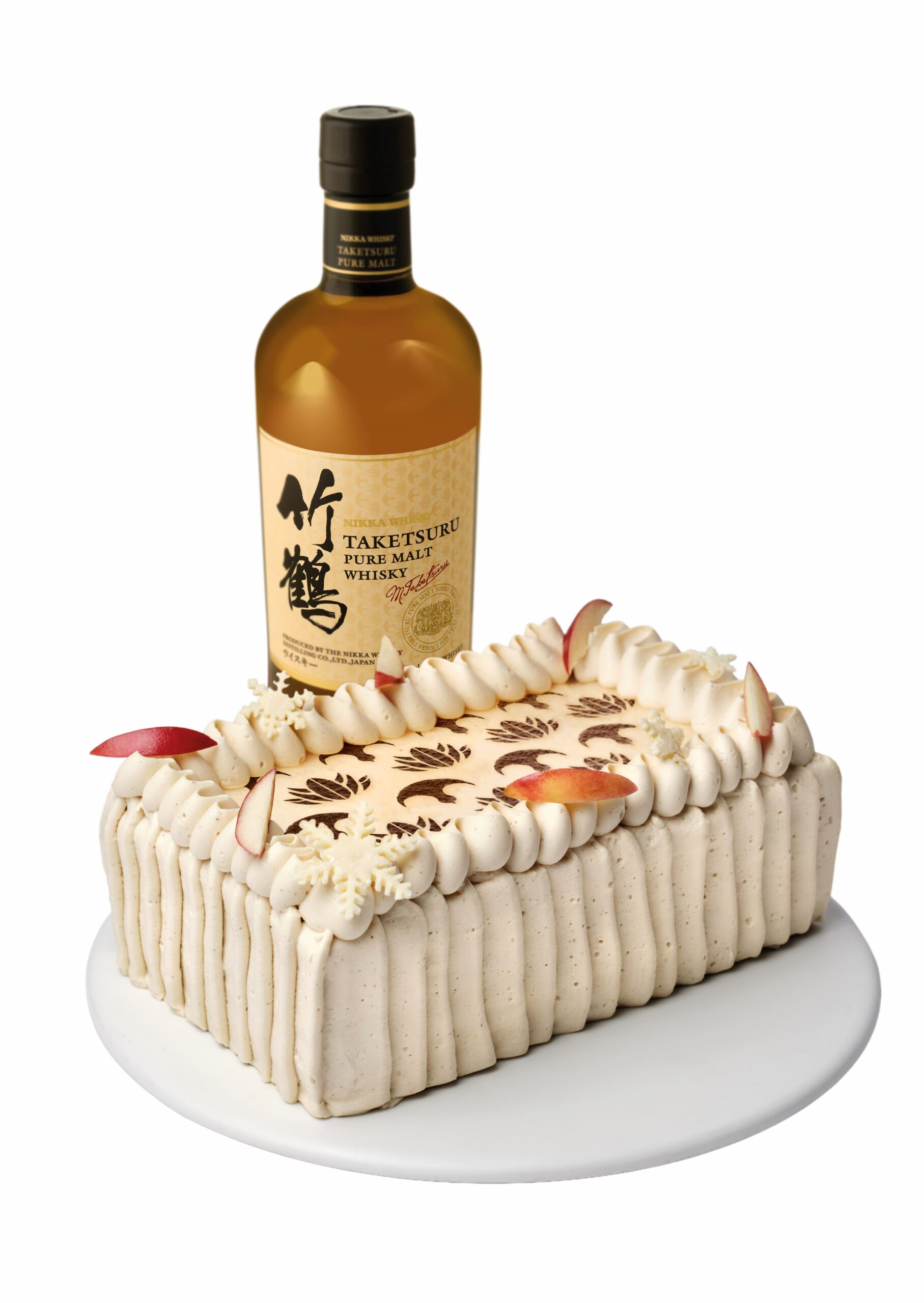 Inspirée de l’histoire de la maison japonaise, la bûche se compose d’une chantilly infusée au sobacha (thé de sarrasin torréfié prisé au Japon) qui dissimule un cœur aux textures multiples. En son centre, une gelée de pomme évoque les débuts de Masataka Taketsuru et de son épouse Rita à Yoichi, première étape de l’aventure Nikka Whisky marquée par la création de jus de pomme et de cidre. Autour, un crémeux onctueux au caramel, une génoise aérienne et une crème subtilement imbibée de Nikka Taketsuru Pure Malt contrastent avec une fine couche croquante de sarrasin et de praliné-noisette, offrant à ce dessert hivernal toute sa richesse et sa générosité.