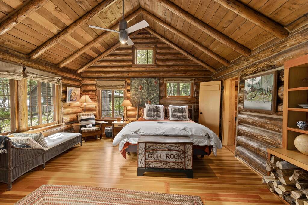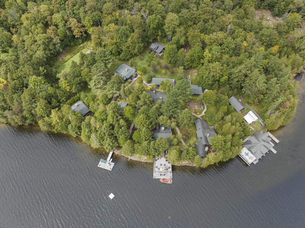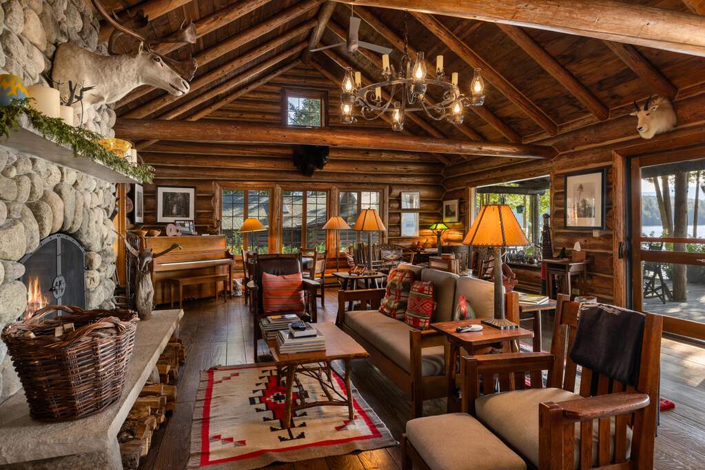 Imaginé en 1902 par l’architecte Max Westhoff pour le magnat ferroviaire Theodore Ely, le domaine déploie près de 1 500 m² de pavillons en bois indépendants, subtilement posés au cœur d’un paysage lacustre préservé. Les intérieurs cultivent une élégance authentique : murs en rondins patinés, plafonds à poutres apparentes, planchers en bois massif et majestueuses cheminées de pierre.