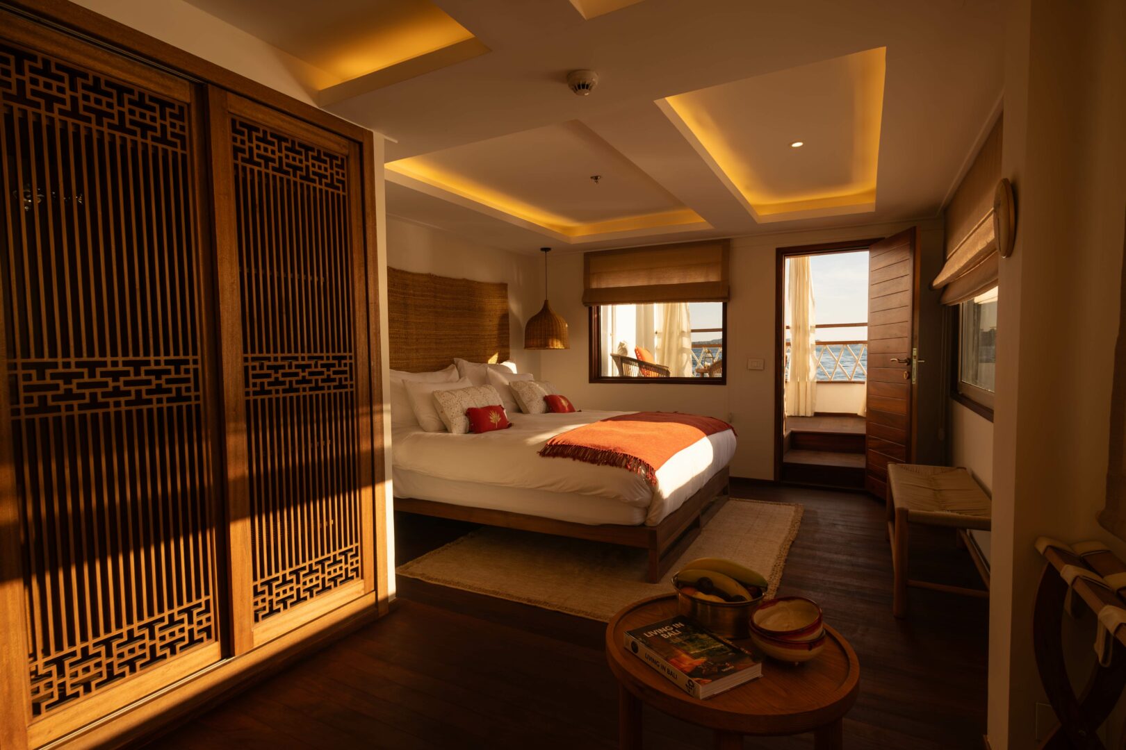 Le Gaïa Dahabiya réimagine un voilier traditionnel sans avoir à faire de compromis sur le luxe et le confort. Le constructeur du navire a principalement utilisé des matériaux d’origine égyptienne pour la rénovation, afin de soutenir l’économie locale et de réduire les émissions dues au transport, tandis que tous les matériaux supplémentaires ont été soigneusement sélectionnés dans la région, renforçant ainsi un réel engagement en faveur des pratiques durables.