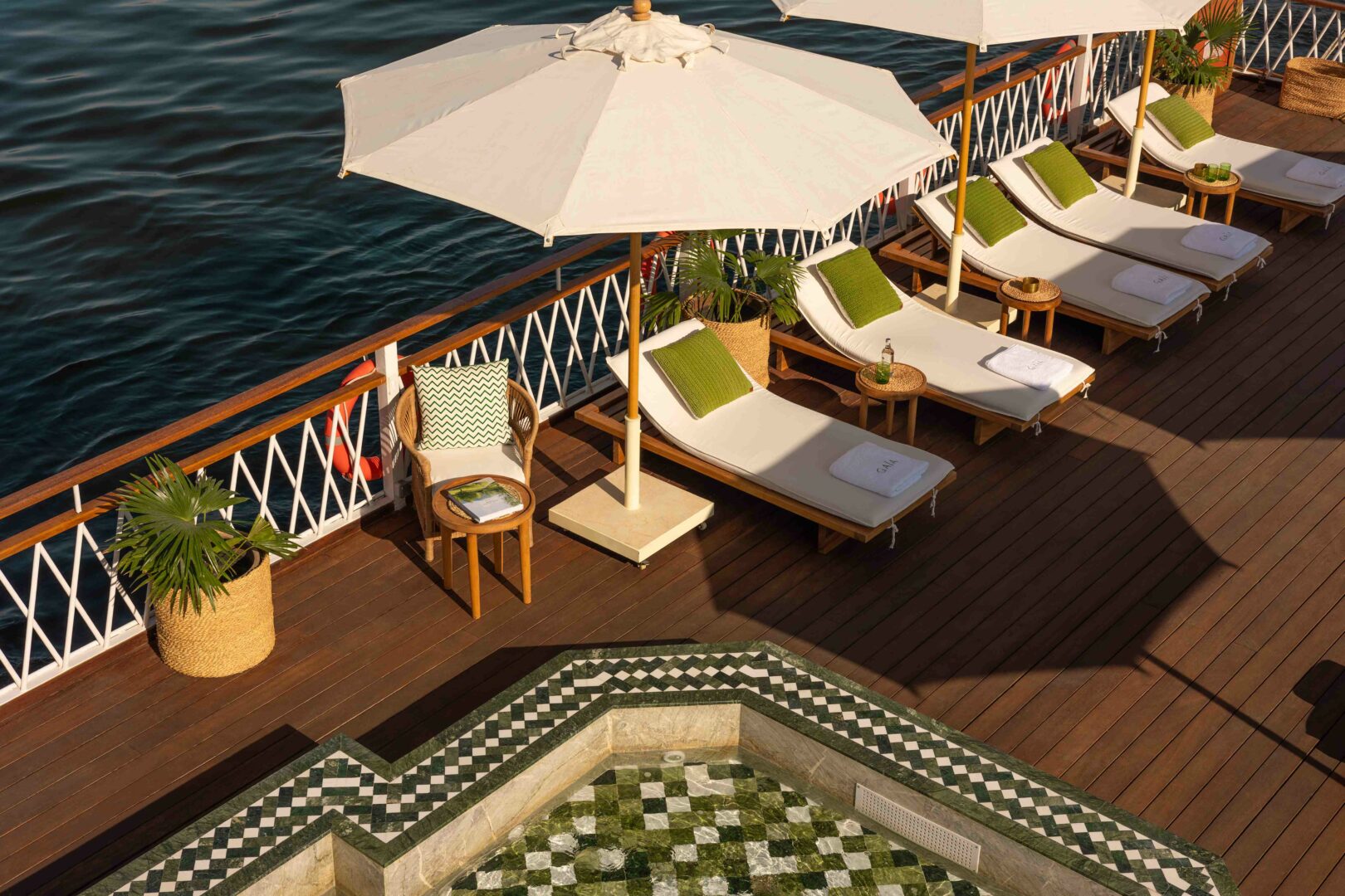 Au cœur du Gaïa Dahabiya, vous trouverez un vaste pont ouvert qui offre des vues panoramiques à couper le souffle, s’étendant à perte de vue. Que vous vous prélassiez au bord de la piscine ou que vous dégustiez un cocktail rafraîchissant au bar, vous serez entourés d’intérieurs aux teintes douces, aux textures organiques et aux couleurs chaudes, créant une atmosphère de confort et de détente inégalée.