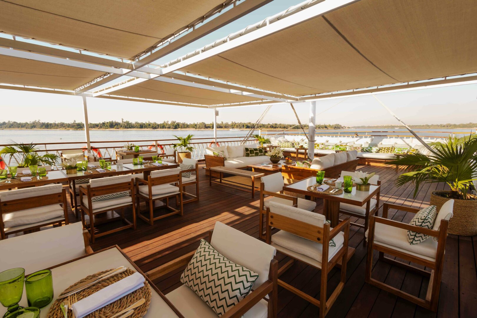 Prenez votre petit-déjeuner, votre déjeuner ou votre dîner sur la terrasse du pont supérieur. Le soir venu, changez de décor et dégustez une cuisine locale authentique dans la salle à manger. Décorée avec goût mêlant éléments en bois naturel et teintes apaisantes, elle vous invite à vivre des expériences culinaires inoubliables. Avec des sièges offrant une vue panoramique sur le Nil sous tous les angles, vous pouvez être assuré que chaque repas satisfera à la fois vos sens et votre appétit…