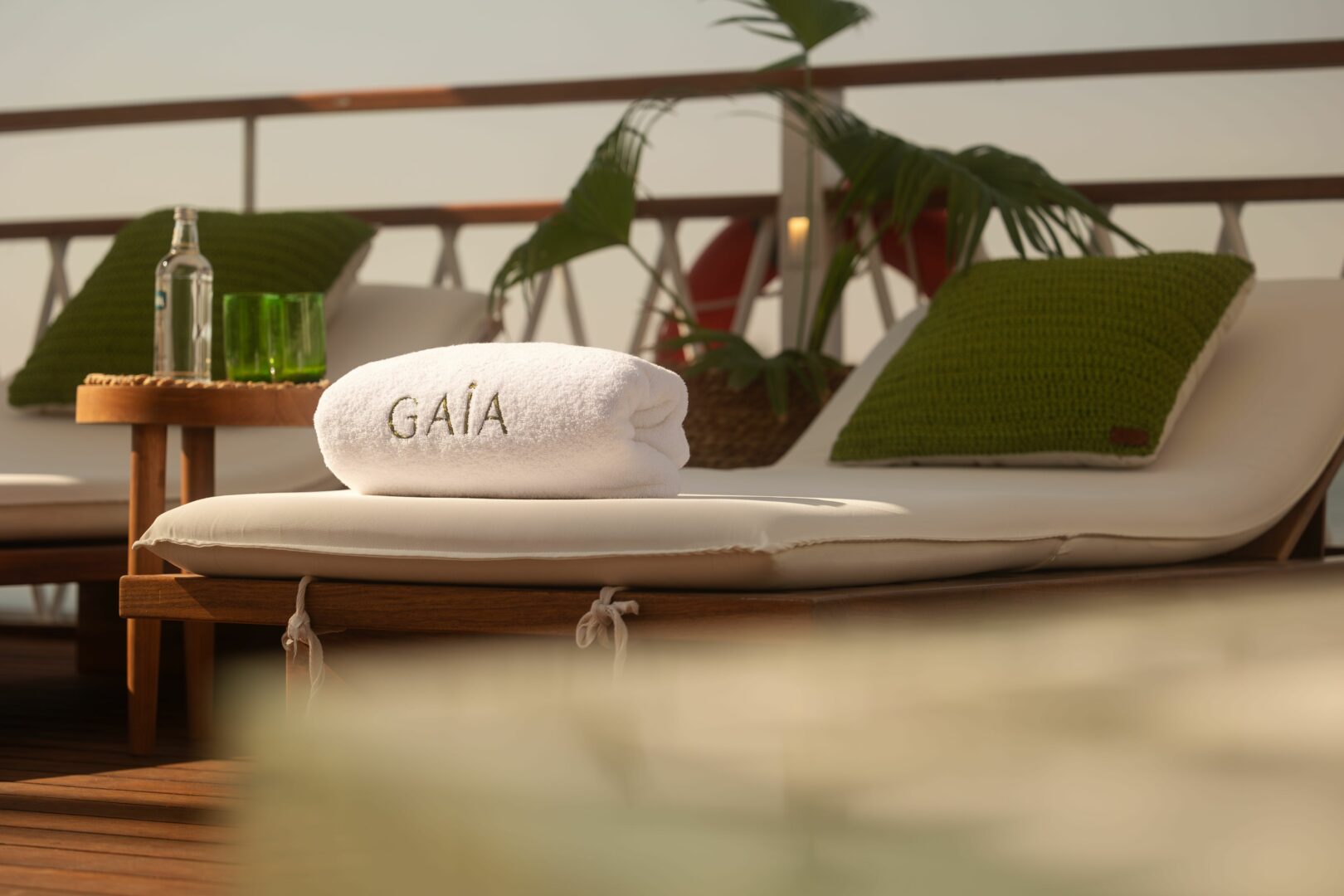 D’une superficie de 20 m², les Suites Gaïa peuvent accueillir jusqu’à deux adultes et un enfant. Elles disposent, en plus des équipements des Cabines, d’un lit supplémentaire en option, d’un balcon privé, offrant un espace personnel pour se détendre et s’imprégner des panoramas environnants.