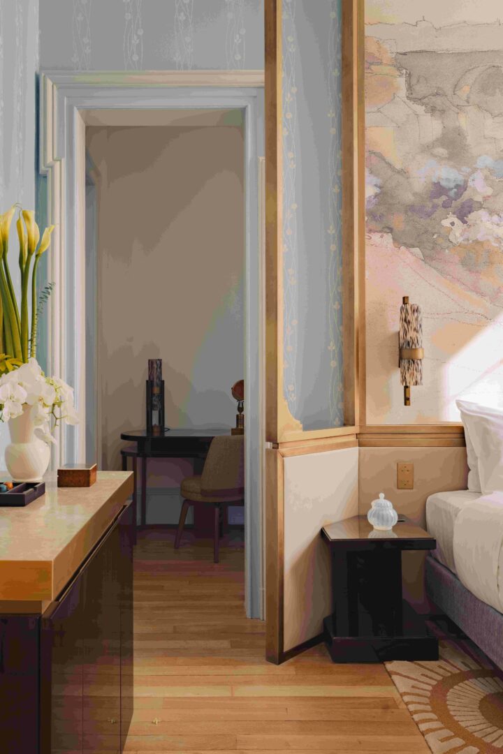 Ce boutique-hôtel de luxe se distingue par son architecture raffinée, mêlant le charme classique à une touche contemporaine. Signé du designer architecte d’intérieur Tristan Auer, le décor s’inspire pleinement de l’esprit du lieu avec la restauration fidèle de certains éléments historiques, comme les précieux papiers peints à la main, reproduction des œuvres de Sosthène Weis, avec des éléments de mobilier dessinés sur mesure pour La Villa Pétrusse.