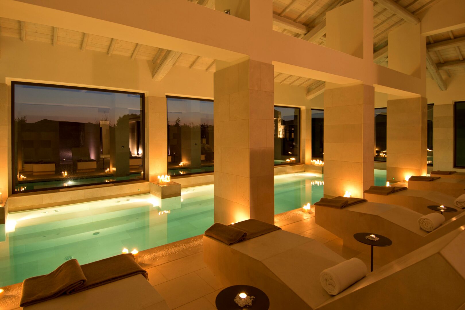 Les bains romains antiques, l’impluvium et la Mer Sèche complètent une gamme plus vaste de soins esthétiques et régénérants, également personnalisables. Une piscine intérieure, d’eau chaude, s’ouvre vers l’extérieur et se prolonge dans la roche, offrant une vue inoubliable sur les oliveraies et le jardin méditerranéen.