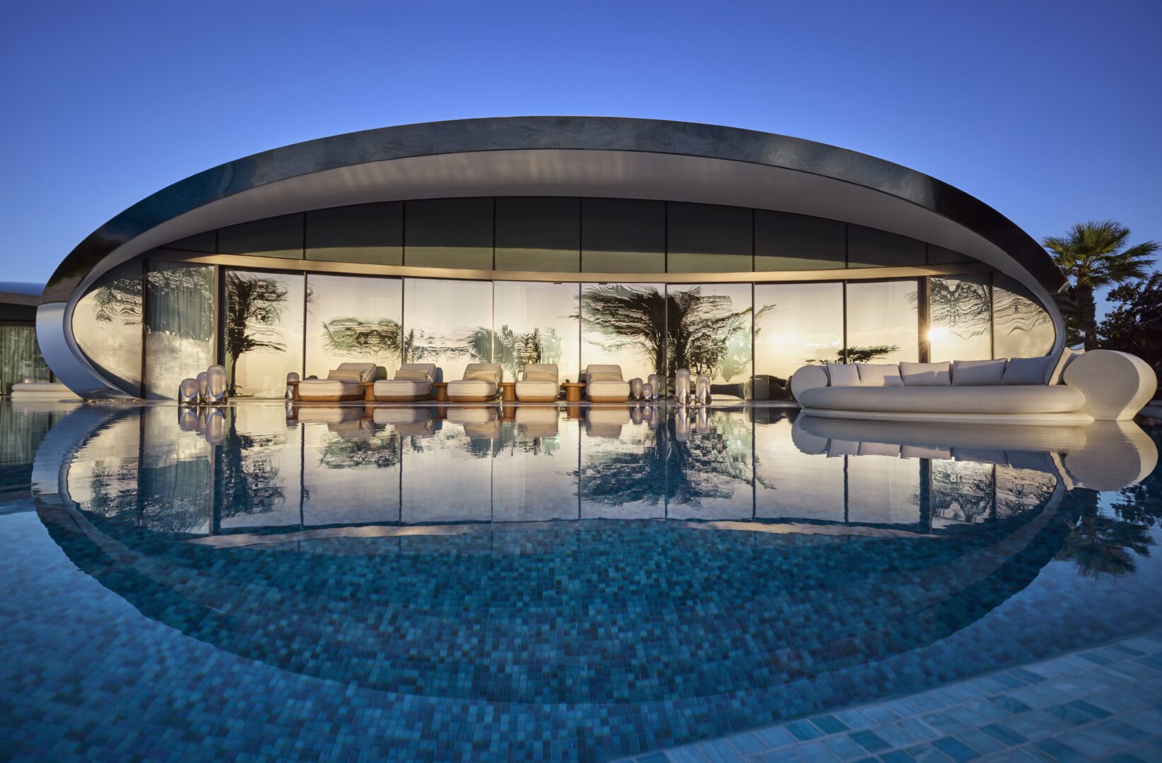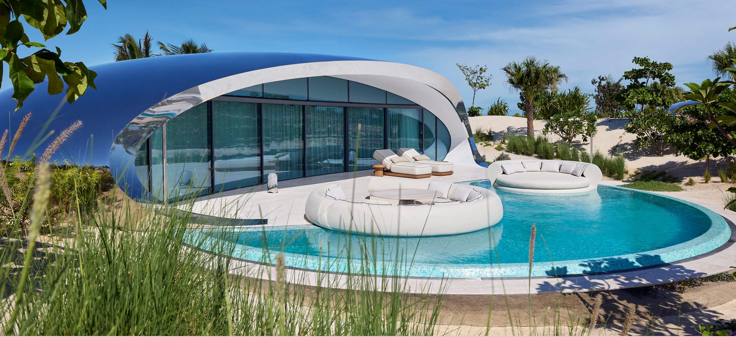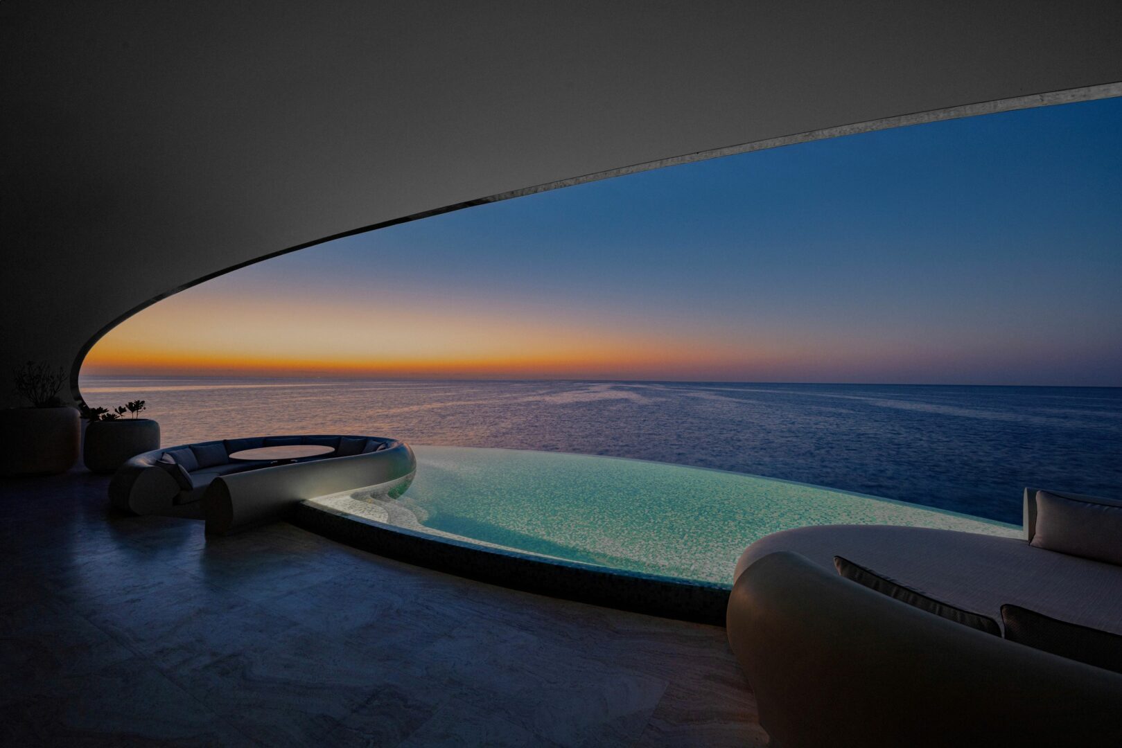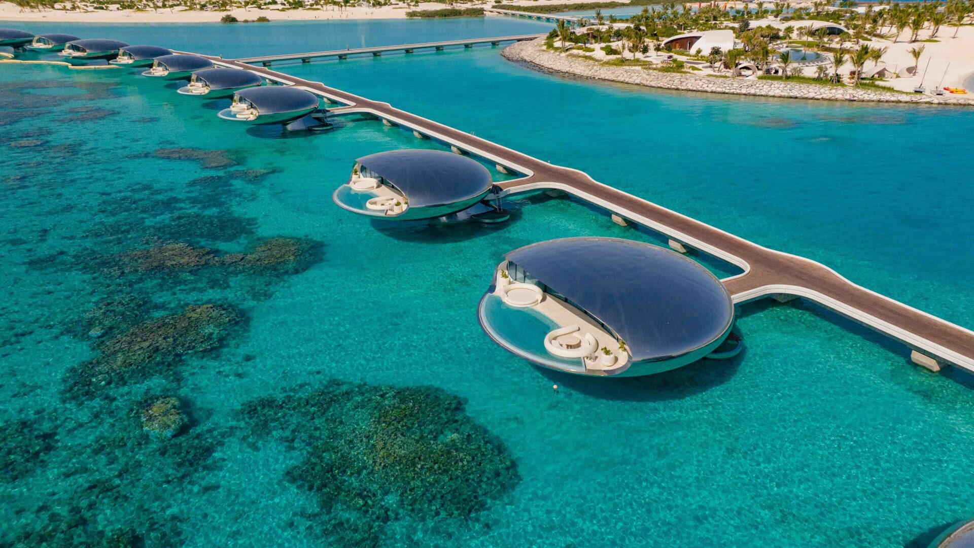 Ces sphères iconiques, imaginées par Killa Design, incarnent l’audace du projet. Suspendues en porte-à-faux au-dessus de l’eau, elles reflètent les mouvements de la mer et capturent les couleurs changeantes du ciel. À l’aube, elles se parent de teintes rosées ; au crépuscule, elles embrasent l’horizon. L’ensemble compose un collier de perles futuriste, convergeant vers un lobby central spectaculaire, lové dans une brèche naturelle du récif corallien -un geste architectural fort et spectaculaire, pensé pour magnifier le site sans jamais le dominer.