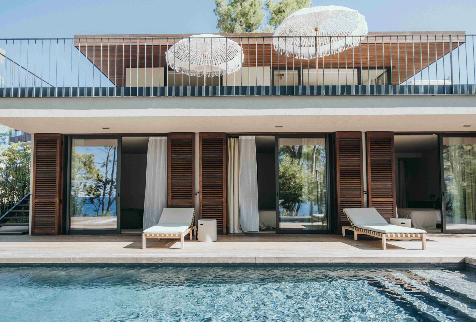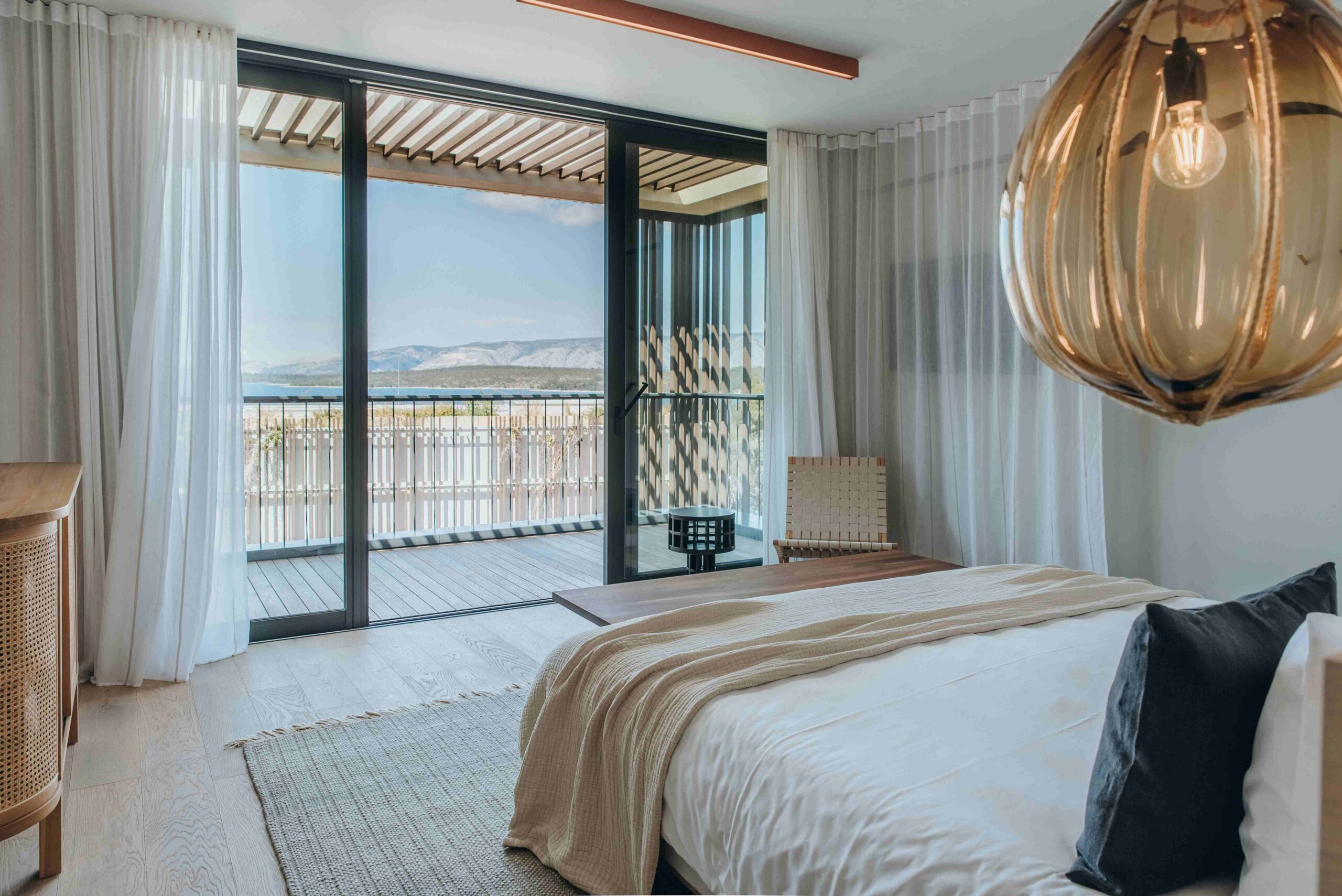 Les cinquante chambres et suites, ainsi que trois villas privées, ont été imaginées comme des refuges contemporains ouverts sur le paysage. Bois clair, pierre naturelle, palette minérale et textiles naturels composent des intérieurs baignés de lumière. De larges baies vitrées prolongent les espaces vers des terrasses tournées vers la mer, tandis que la piscine panoramique offre une perspective spectaculaire sur la baie.