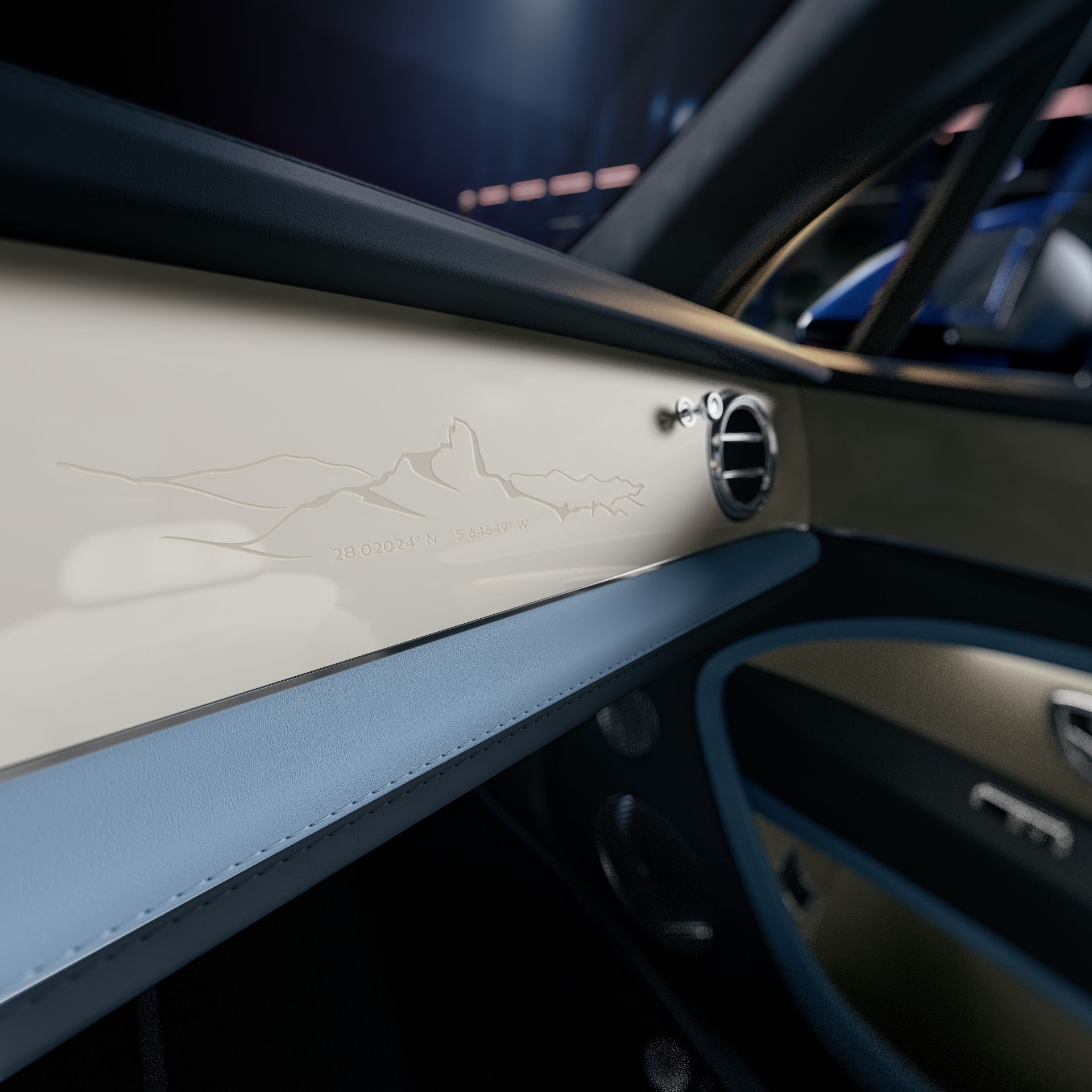 Les coordonnées géographiques du célèbre rocher apparaissent également dans le design, transformant l’habitacle en véritable hommage discret à l’origine du nom Bentayga. Jusqu’aux lampes d’accueil et aux seuils de porte éclairés qui prolongent cette signature graphique.